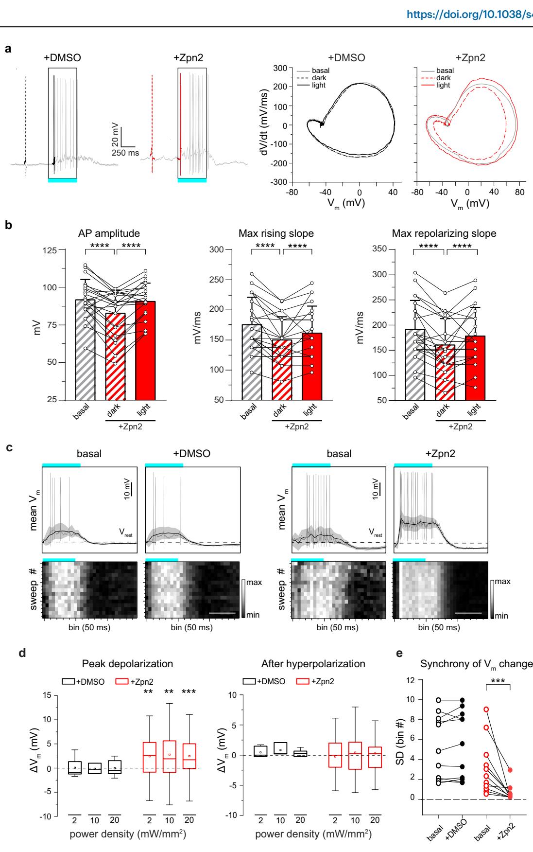 Fig. 2 | The light-evoked capacitance change by Ziapin2 induces faster AP dynamics and membrane depolarization in the WT retina. a Left: Representative whole-cell current-clamp traces recorded in two RGCs in the presence of either vehicle (10% v/v DMSO; left, black) or Ziapin2 (200 µM; right, red) showing the first spike in the dark (dashed line) and the first light-evoked spike (solid line). Right: Phase-plane plot analysis of the waveform of the first APs in the dark (dashed lines) and during cyan light stimulation (solid line; 20 mW/mm2 , 500 ms) after puff application of either DMSO (black) or Ziapin2 (red), compared to the AP waveform in the dark under basal conditions (gray lines). b Changes in AP amplitude (left), maximal rising slope (middle), and maximal repolarizing slope (right) deduced from the phase-plane plot analysis of each recorded RGC before (basal) and after Ziapin2 application in the dark and under cyan light stimulation. Bars represent means ± SEM with superimposed individual points (n = 22 RGCs). c Top: Representative lowpass-filtered voltage traces recorded from RGCs before (basal) and after treatment with either vehicle (10% v/v DMSO; left), or Ziapin2 (200 µM; right) in a time window of 1.5 s, starting from the onset of the light stimulation (500 ms, cyan horizontal bar). The plots display the mean (± SD, gray area) Vm calculated within the same time window over 15 sweeps. Vrest (dashed line), membrane potential in the dark. APs are superimposed on the voltage traces. Bottom: Grayscale representation of Vm changes during the 15 sweeps (50-ms bins). Scale bars, 500 ms. d Box plots of peak depolarization (left) and peak after-hyperpolarization (right) calculated as the difference with respect to Vrest (see c) in RGCs treated with either vehicle (10% v/v DMSO; black) or Ziapin2 (200 µM; red) and stimulated with cyan light at increasing power densities (2, 10, and 20 mW/mm2 ; n = 12 and 34 for DMSO and Ziapin2 puffs, respectively). The box plot center line represents the mean, the square in the box is the median, box boundaries show the first and third quartiles, and whiskers display the minimum and maximum values. e Evaluation of the synchrony of voltage changes in response to cyan light before (basal) and after Ziapin2 or DMSO puff application (n = 10 and 11 RGCs for DMSO and Ziapin2 puffs, respectively). **p < 0.01, ***p < 0.001, ****p < 0.0001; two-tailed paired Wilcoxon’s signed-rank versus basal. Exact p-values and source data are provided as a Source Data file.