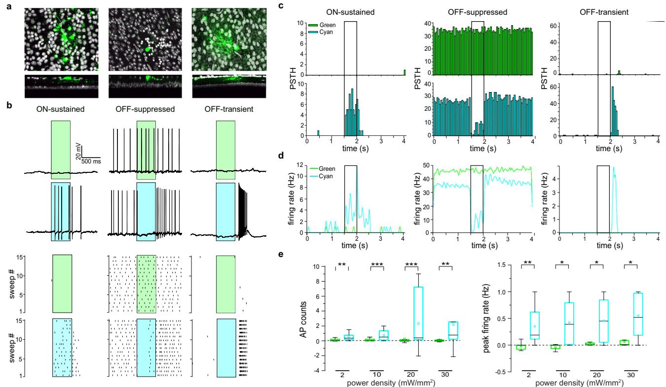 Indeed, after whole retina treatment, Ziapin2 reactivated a variety of RGC responses, including ON and OFF responses to cyan light with varying dynamics, ranging from transient to sustained and suppressed (Fig. 3a–d). Total AP counts and peak instantaneous firing rate significantly increased in response to cyan light at all tested power densities, ranging from 2 to 30 mW/ mm2 , but not to green light (Fig. 3e). When we retrospectively studied the 3D morphology of the recorded RGCs labeled with AlexaFluor-633 by confocal microscopy, as previously described55, we found that the responses evoked by cyan light were always consistent with the stratification of the dendrites in the inner plexiform layer of all recorded RGCs (Fig. 3a).
