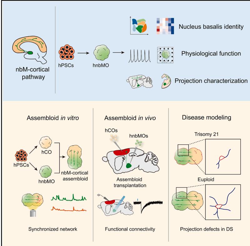 Here, we developed an approach for differentiating hPSCs into nbM organoids that encompassed functional CHNs in vitro and in vivo. Then we fused human nbM organoids (hnbMOs) with human cortical organoids (hCOs) to form nbM-cortical assembloids. We verified that CHNs project to hCOs and form functional connectivity in nbM-cortical assembloids. An innovative dual-transplantation approach was developed by transplanting corresponding organoids into the cortex and nbM region, thereby establishing a complete human cholinergic projection system. Furthermore, we identified the defects in the projection of CHNs in assembloids derived from DS induced pluripotent stem cells (iPSCs). Our work establishes a new approach for the study of neurological disorders associated with the nbMcortical CHN circuit.
