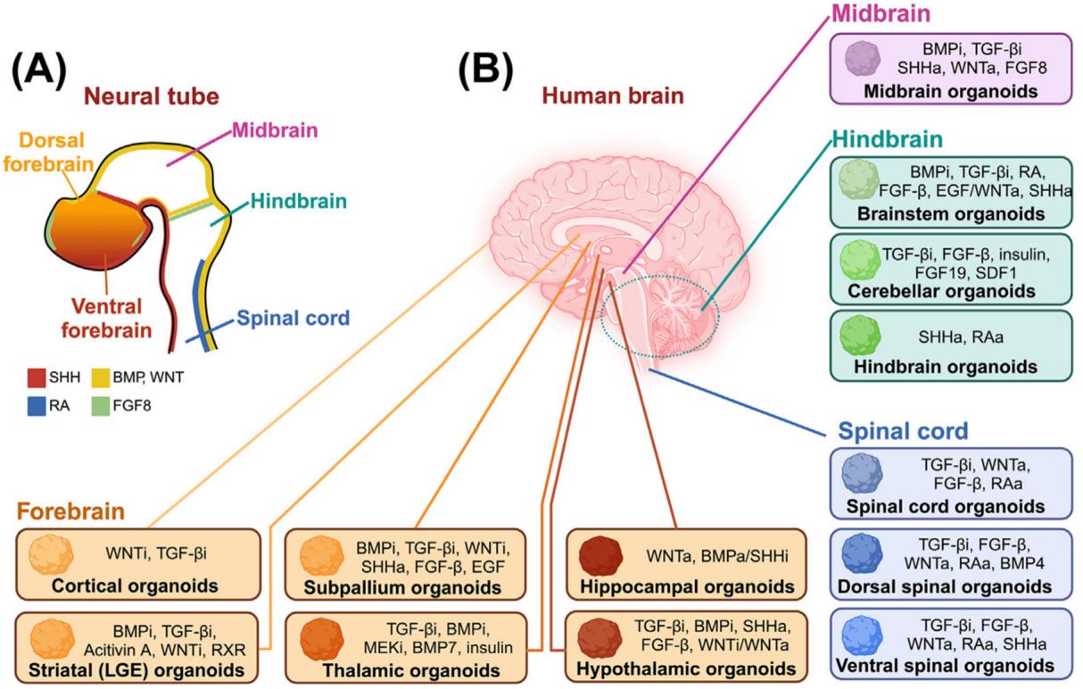 在过去>10年中,已培育出多种简易形式的脑类器官;然而这些模型始终存在两大根本性局限。首先,由多能干细胞自发分化形成的脑/大脑类器官仅能重现包含若干混杂无序脑区的基础类脑组织,且各区域边界模糊不清[2]。随后科研人员着力开发能够特异性重现特定脑区特征的区域特异性脑类器官。这类器官通过体外模拟引导体内各脑区神经发育的模式形成信号与形态发生信号而构建(图1)[7,8]。例如:在诱导初期数日内采用双重SMAD抑制(BMP抑制 +. 与TGF-β抑制)诱导神经外胚层命运[8-10];继而通过WNT与TGF-β抑制引导类器官向皮质命运分化[3];或采用WNT抑制、TGF-β激活、RXR与SHH刺激获得含有外侧神经节隆起(LGE,见术语表)细胞的纹状体类器官[11,12]。通过联合WNT抑制与FGF- ⋅β 、EGF及SHH刺激,成功培育出具有内侧神经节隆起(MGE)特征的基底层类器官[13]。此外,采用双重SMAD抑制后接续BMP7、胰岛素及MEK抑制剂处理,可生成丘脑类器官[14]。而在激活WNT通路的基础上无论是BMP通路激活还是SHH通路抑制都导致了海马体类器官的生成[10,15],而WNT通路的调节结合BMP抑制、SHH激活和FGF-β则导致了丘脑下部的特化[7,10]。关于中脑类器官的特化,已经设计了多种方案,这些方案利用了BMP和TGF-β抑制剂以及WNT、SHH和FGF-8通路激活剂[7,9,16,17]。此外,通过使用视黄酸(RA)和/或FGF通路刺激剂进行尾部命运模式化,已经开发出再现后脑和脊髓的类器官[18–24]。除了这些模式化线索和信号通路调节剂外,神经营养因子如脑源性神经营养因子(BDNF)和胶质细胞源性神经营养因子(GDNF)通常被添加到培养基中以增强类器官的成熟[7,17,20]。除了直接向类器官培养中添加形态发生素外,一种最近开发的方法涉及在微流体装置中同时将PSCs或胚胎体暴露于多个正交形态发生素梯度。这使得化学梯度更可控,并同时生成了神经管或不同脑区的类器官[25,26]。总之,在类器官发育过程中适时控制命运决定线索和信号转导通路,使得能够生成大量区域特异性脑类器官。