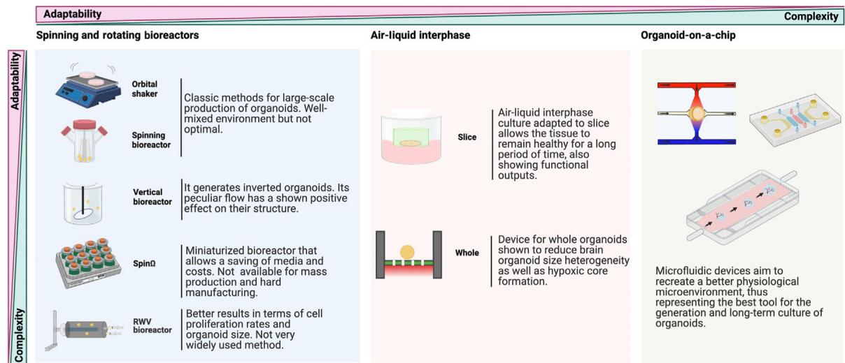 - 旋转壁式生物反应器(RWV bioreactor):在细胞增殖率和类器官大小方面效果较好,但并非广泛使用的方法。