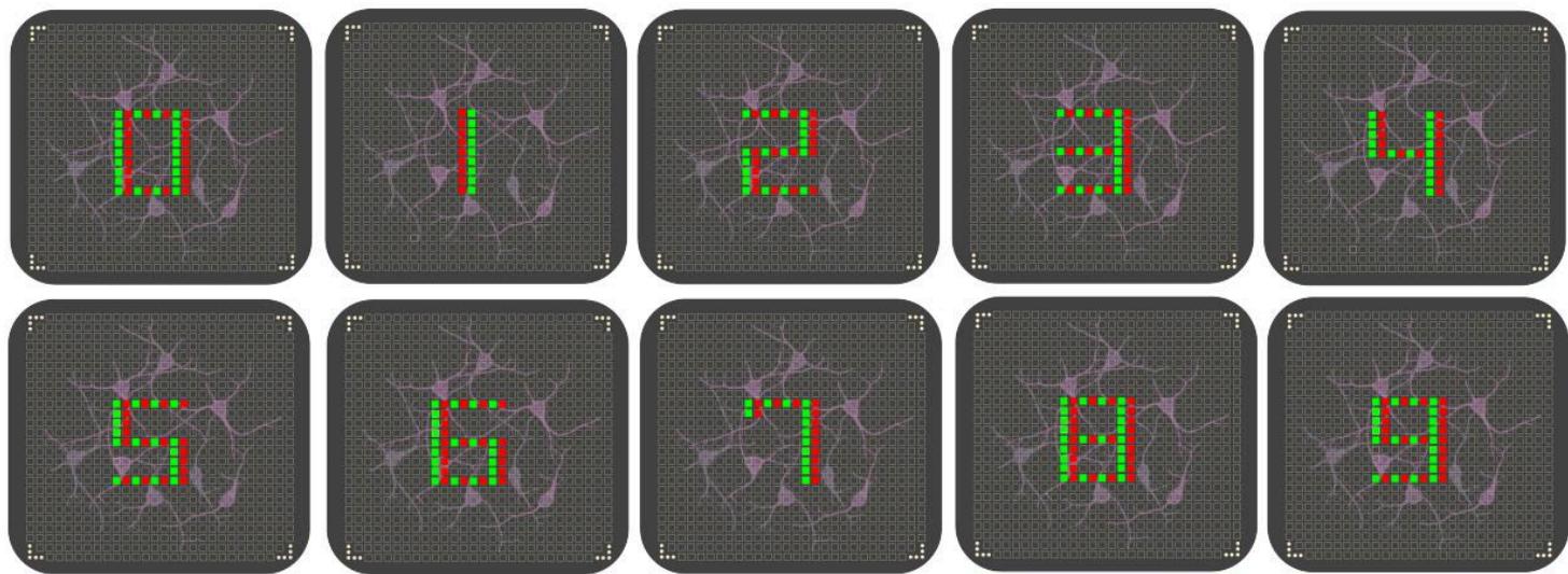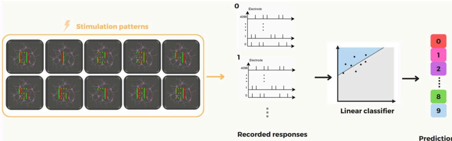 具体而言,BRC系统构建于高密度多电极阵列(MEA)[4]之上,该系统既能进行电刺激,又能实现神经活动的高分辨率记录。神经元通过成熟的分化方案[7,8]从干细胞中培育获得,成熟后会形成自发性活跃网络。输入模式被编码为空间分布的刺激序列,并通过MEA传递至培养神经元。由此产生的神经响应被记录并用于构建特征向量,以供后续分类任务使用。为评估BRC系统生成判别性特征表征的能力,我们开展了一项聚焦于单一且具有挑战性的模式识别任务的实验研究:对十种类似数字的空间输入模式(从0到9)进行分类。每种模式由多电极阵列上不同空间构型的电刺激位点定义。记录诱发神经响应并将其作为简单读取层的特征,以对刺激类别进行分类。