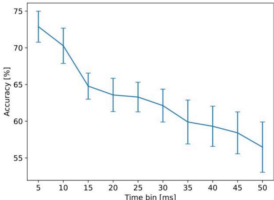 图5呈现的结果,整合了来自 组独立刺激实验的数据,这些实验在不同日期开展,且覆盖了多次生物学重复。结果呈现出明显的下降趋势:当 时,分类准确率始终维持在最高水平。这表明,从不同刺激的可区分性角度而言,包含信息最丰富的响应信号,出现在刺激施加后的最初几毫秒内。