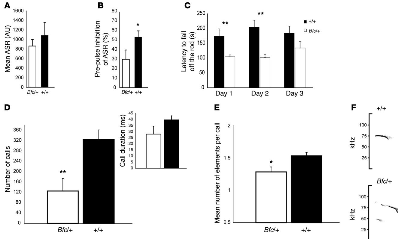 我们研究了小鼠的特定行为,这些行为与人类智力障碍病例中明显的缺陷相关,包括运动功能障碍、认知能力缺陷和发声异常。听觉惊吓反应(ASR)(图4A)及其前脉冲抑制(PPI)(图4B)反映了动物对感觉信息作出反应和整合的能力(19)。Bfc/+小鼠表现出持续且显著的前脉冲抑制缺陷,而听觉惊吓反应正常。运动缺陷存在但更为细微。在典型的旋转棒测试中,Bfc/+小鼠未表现出显著缺陷(数据未显示)。然而,当采用更具挑战性的测试方案——在单次会话中连续进行6个加速阶段测试时,Bfc/+小鼠从棒上坠落的潜伏期显著缩短,且这种差异在多次重复进行3天(图4C)。小鼠在特定条件下会发出超声波叫声,例如母婴分离时。我们在出生后第6天通过将幼崽与母鼠分离5分钟来测试超声波发声。我们观察到突变体的总叫声次数显著减少(图4D)。每次叫声的平均持续时间略有缩短,但不显著。最后,突变体幼崽产生了更多以单一成分为特征的叫声(图4E和F),表明它们发育出了复杂度较低的发声系统。