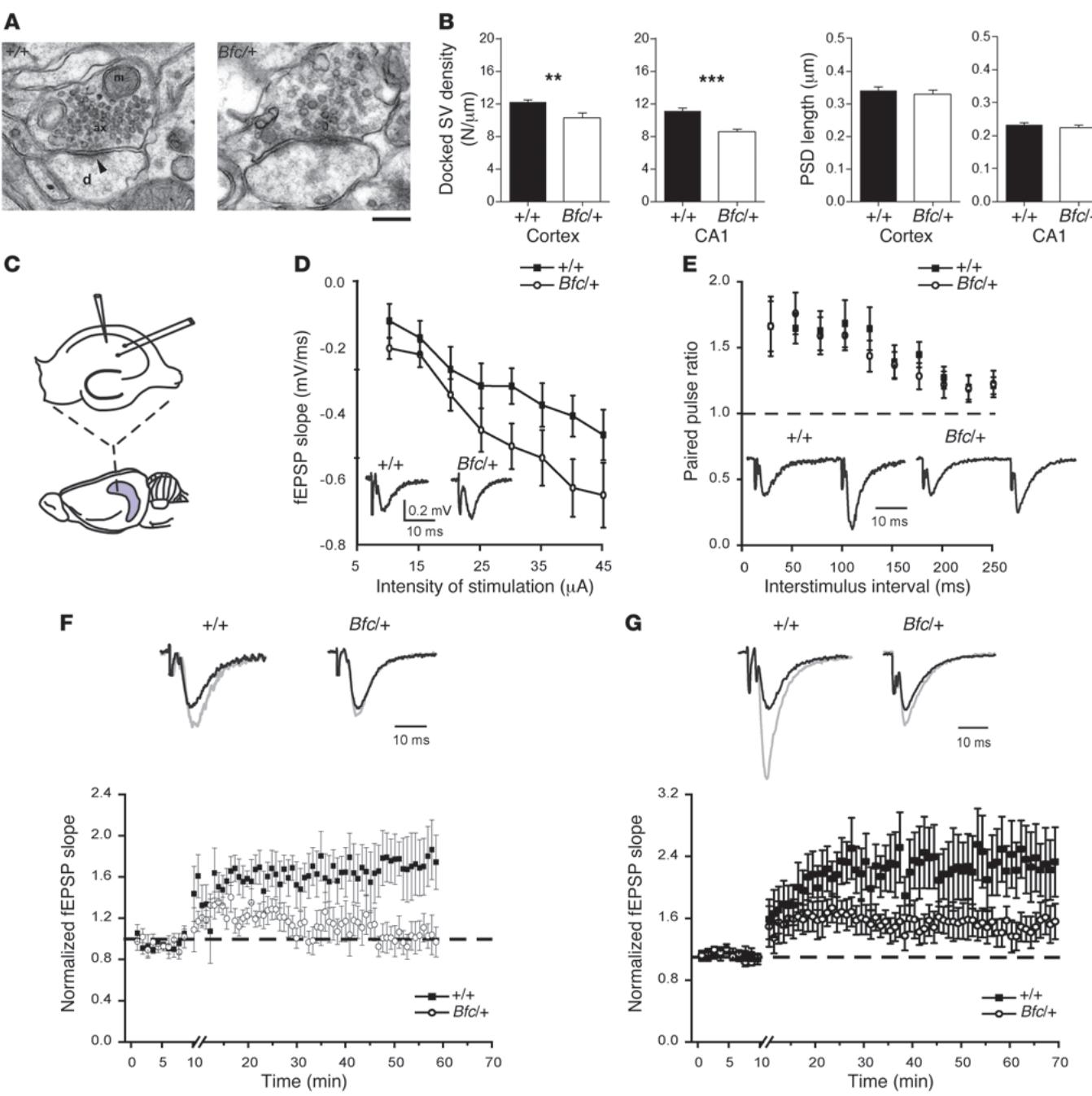 图 8 Bfc 成年海马体的形态和功能性突触缺陷。(A) 野生型和杂合子CA1突触的代表性电镜图像:显示包含突触小泡簇和线粒体(M)的突触前轴突终末(ax),以及突触后神经元树突(D);突触后致密区(PSD)亦可见(箭头标示)。标尺:200纳米。(B) 使用ImageJ对142个CA1和128个皮质 兴奋性突触前终末 )及152个CA1和115个皮质Bfc 兴奋性突触前终末 )进行膜锚定突触小泡密度(小泡数 米)和PSD长度(μ米)定量分析。©在成年海马切片中进行电生理记录的实验配置。(D) 野生型(黑色方块, 只小鼠,10切片)和Bfc/+(白色圆圈, 只小鼠,10切片)海马切片中fEPSP斜率与注入电流的函数关系。插图显示代表性波形。(E) 野生型 只小鼠,9切片)和Bfc 只小鼠,9切片)小鼠配对脉冲比率与刺激间隔的函数关系。插图波形均一化至首刺激fEPSP振幅。(F和G) 强直刺激(F)或θ串刺激(G)前后野生型(黑色方块)与Bfc/+(白色圆圈)切片中fEPSP斜率变化。数值均一化至对照组fEPSP斜率值。(F) 野生型 只小鼠5切片;Bfc/+ 只小鼠6切片。(G) 野生型 只小鼠5切片;Bfc/+ 只小鼠6切片。插图波形均一化至对照组fEPSP振幅。 , 。