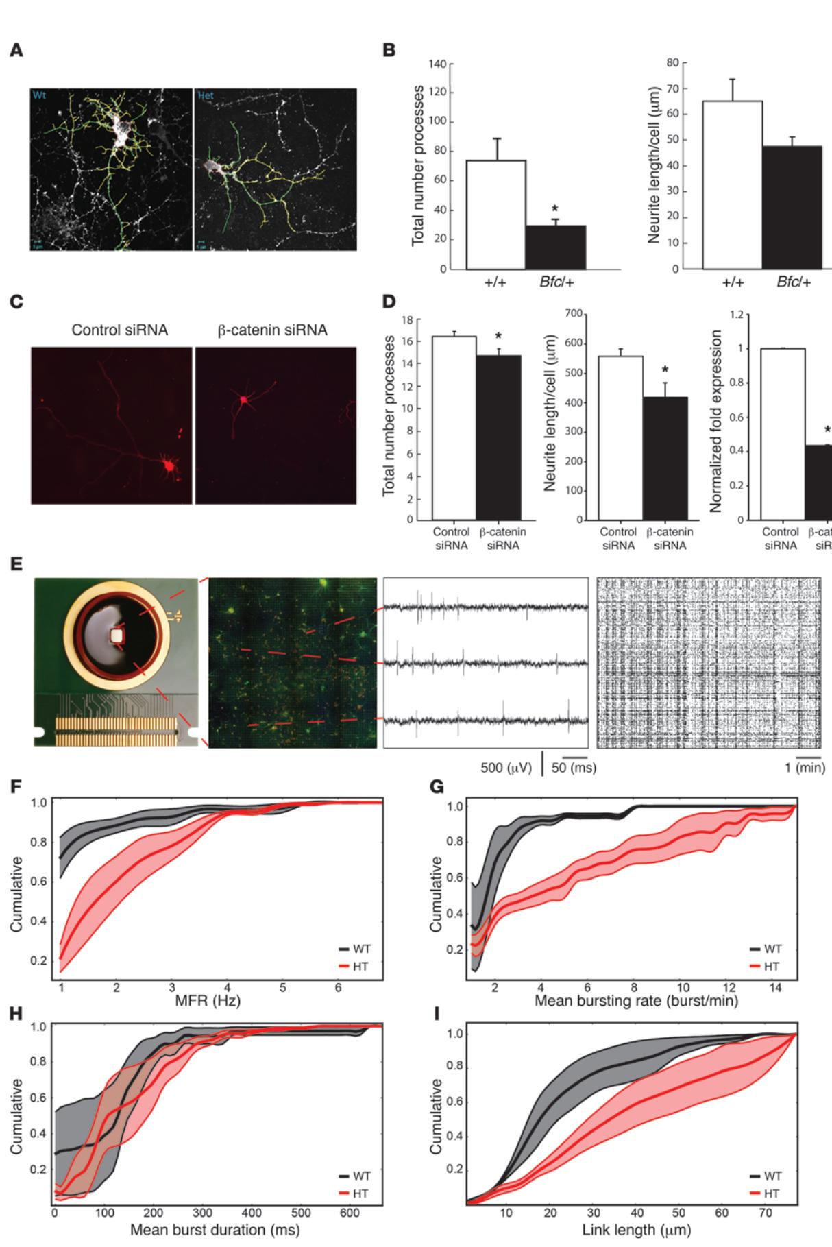 图7 Bfc 原代海马神经元培养物的形态和功能缺陷。(A)培养8天后 与Bfc/+海马神经元原代培养的代表性图像。比例尺如图所示。初级突起呈绿色,次级突起呈黄色。(B)呈现突起数量和神经突长度。Bfc/ 神经元的突起显著减少。 ,双尾t检验。(C)在1 DIV时转染β-连环蛋白或对照siRNA,7 DIV时固定的神经元培养物代表性图像。(D)RT-qPCR评估显示,针对 -连环蛋白的siRNA有效降低了mRNA表达( ),而转染β-连环蛋白的神经元中神经突延伸显著减少( )。(E)体外神经元网络设置示意图(从左至右):高密度MEA芯片、低密度培养荧光图像( -微管蛋白绿色,NeuN红色)显示电极阵列部分区域(黑色方框)的稀疏网络分布、3个不同通道采集的锋电位活动原始数据轨迹、约400个活跃通道(即发放频率> 0.1 spikes/s)的光栅图显示同步发放和持续簇状放电活动。(F–I)网络参数累积分布图( 黑色, ;Bfc/+红色, )。粗线与阴影区域表示均值 。Bfc 培养物兴奋性更高,表现为更高的MFR(F)和MBR(G)。MBD变化较不明显(H)。基于互相关的功能连接分析显示Bfc/+的功能连接长度也更高(I)。
