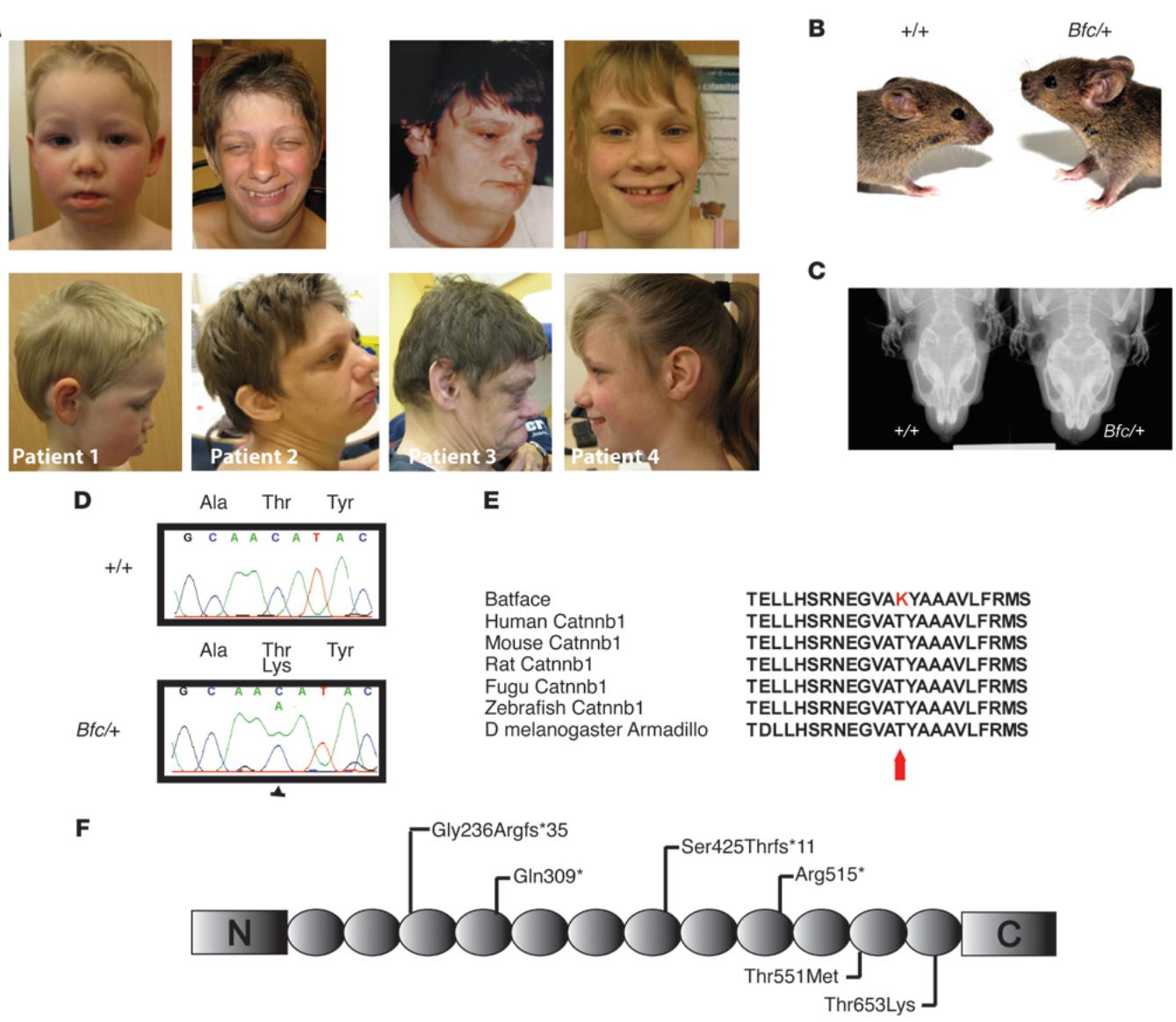 通过高通量基因组学方法,近期有证据表明β-连环蛋白与人类认知障碍存在关联(11, 12)。大规模测序研究发现,CTNNB1上的罕见新生点突变是导致智力障碍(ID)(13)和自闭症谱系障碍(ASD)(12)的主要因素。这些研究在CTNNB1中发现了4个潜在致病突变:其中3个是ID患者的功能缺失突变(p.Ser425Thrfs*11、p.Arg515*和p )(13),另有1个是ASD患者的错义突变(p.Thr551Met)(12)。继我们先前的ID研究之后,本文对患者的表型特征进行了完整表征。此外,我们近期新发现一名携带从头突变CTNNB1(c.705dup;p.Gly236Argfs )的个体,此病例的突变数据与临床表现系首次披露。与此同时,我们鉴定出名为batface(Bfc)的小鼠模型,该模型因N-乙基-N-亚硝基脲诱导(ENU诱导)在β-连环蛋白中产生错义突变。Batface突变体表现出特殊的形态学、行为学、分子生物学及生理学异常,这些异常与同源人类病症存在显著对应人类疾病状况。我们收集并分析了人类患者及小鼠模型的表型数据,从而全面揭示 -连环蛋白在这些严重神经发育疾病的发病与进展过程中所起的作用。