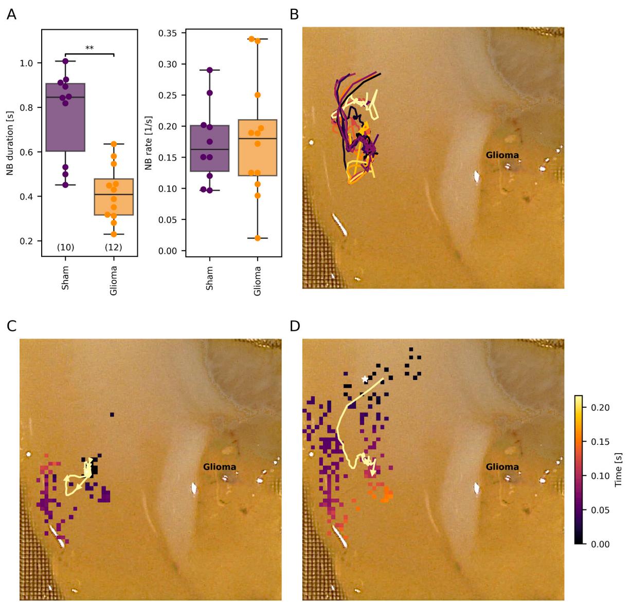 假手术对照组切片的平均NB持续时间显著长于胶质瘤荷瘤动物切片(假手术组中位数:0.85秒,胶质瘤组:0.41秒,p = 0.001,Mann-Whitney U检验,图5A)。