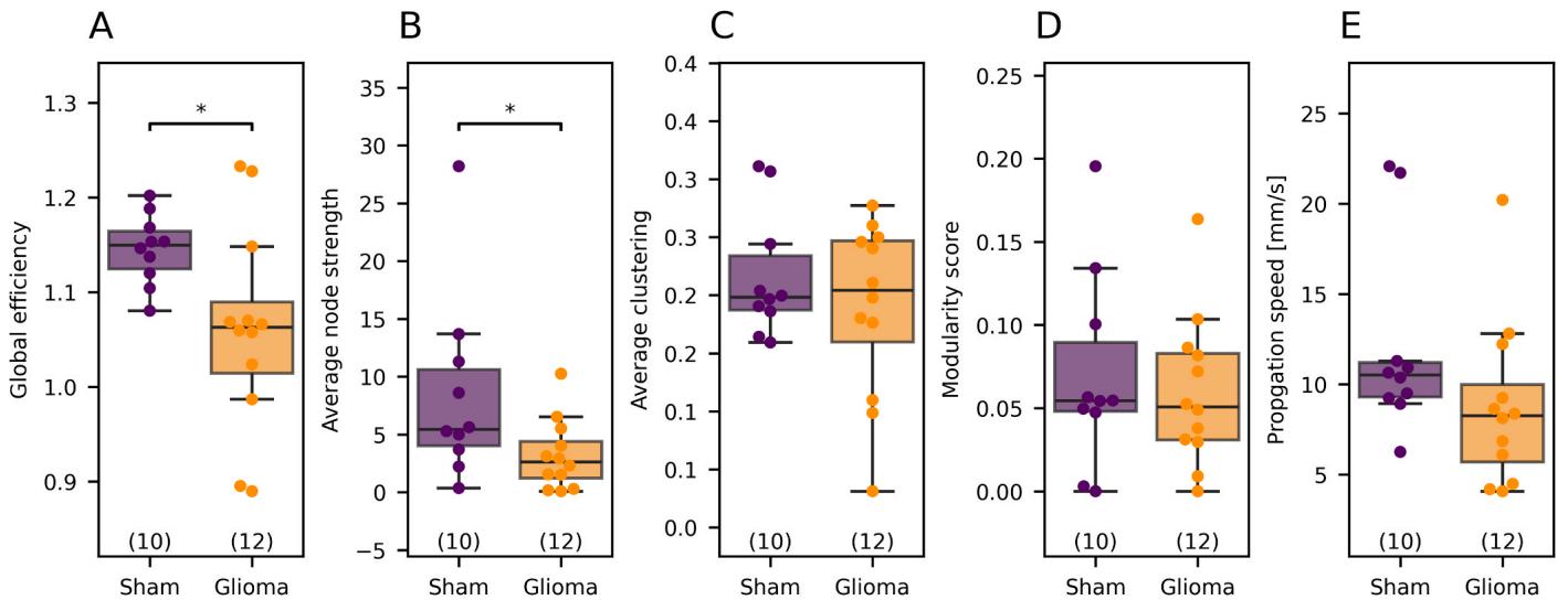 图6. 基于STTC值和传播速度的图论指标。(A)假手术网络显示出显著更高的全局效率(*p = 0.0229)和(B)平均节点强度(*p = 0.0443)。然而,(C)平均聚类系数(p = 0.7667)和(D)模块化分数(p = 0.7169)没有显著差异。(E)传播速度没有显著差异(p = 0.0602),但胶质瘤切片的传播速度有明显降低的趋势。须线延伸至位于上下四分位数1.5倍四分位距内的点。p值参考曼-惠特尼U检验。