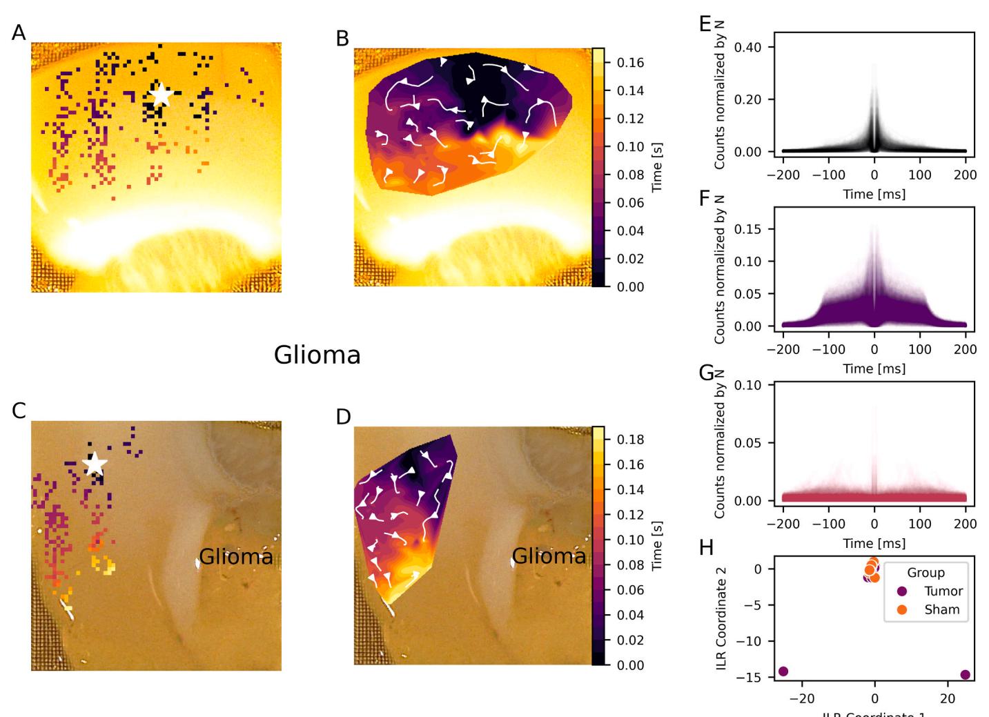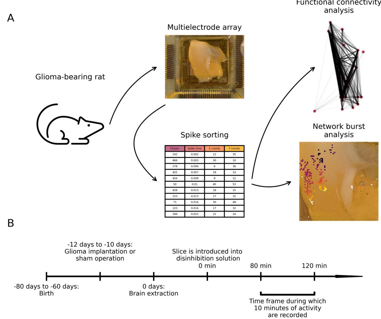 计算硬件和信号处理方面的进步现已能够同时捕获和分析来自数千个电极的信号。高密度多电极阵列(HD-MEAs)为研究各种中枢神经系统疾病提供了机会(Emery等人,2025年,Kragelund等人,2025年,Quintanilla等人,2025年)。然而,迄今为止,只有小型MEA系统被用于体外研究胶质瘤的影响(Gill等人,2020年)。在此,我们提出了一种新方法,用于分析来自处于高兴奋性条件下的荷瘤大鼠脑切片的HD-MEA数据,以诱导网络爆发(NBs)。
