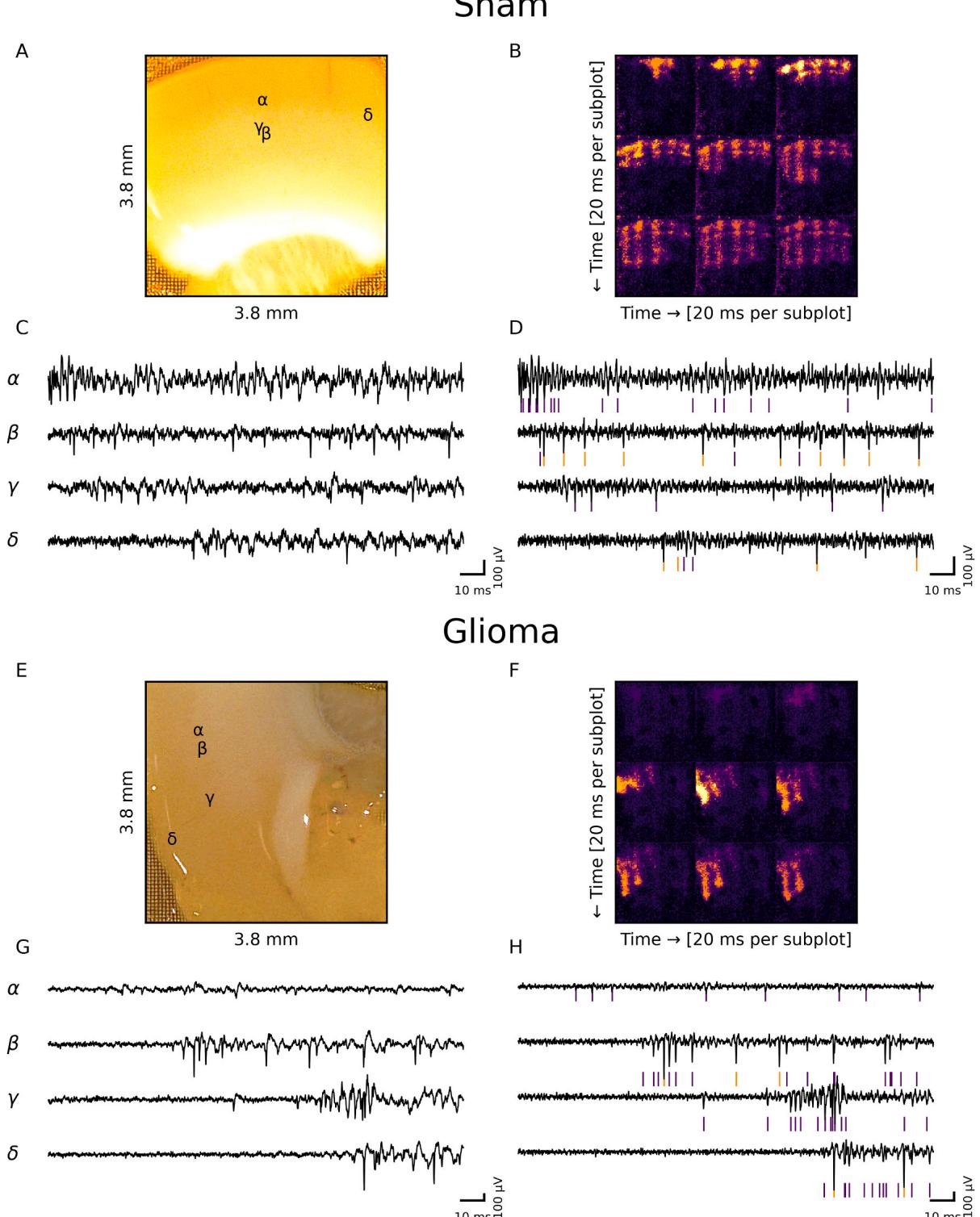 图3. 典型的网络爆发事件。(A) 放置在MEA上的假手术动物脑切片照片。(B) 九个热图,代表网络爆发开始后20毫秒间隔内通道的标准差。© 用50Hz硬件高通滤波器记录的轨迹。它们在切片上的位置用希腊字母表示。(D) 300Hz高通滤波后与©相同的轨迹。检测到的尖峰用彩色垂直线表示。如果一个电极检测到多个单元,尖峰将用不同颜色表示。(E) 放置在MEA上的胶质瘤荷瘤动物脑切片照片。(F) 九个热图,代表网络爆发开始后20毫秒间隔内通道的标准差。(G) 用50Hz硬件高通滤波器记录的轨迹。它们在切片上的位置用希腊字母表示。(H) 300Hz高通滤波后与(G)相同的轨迹。检测到的尖峰用彩色垂直线表示。如果一个电极检测到多个单元,尖峰将用不同颜色表示。
