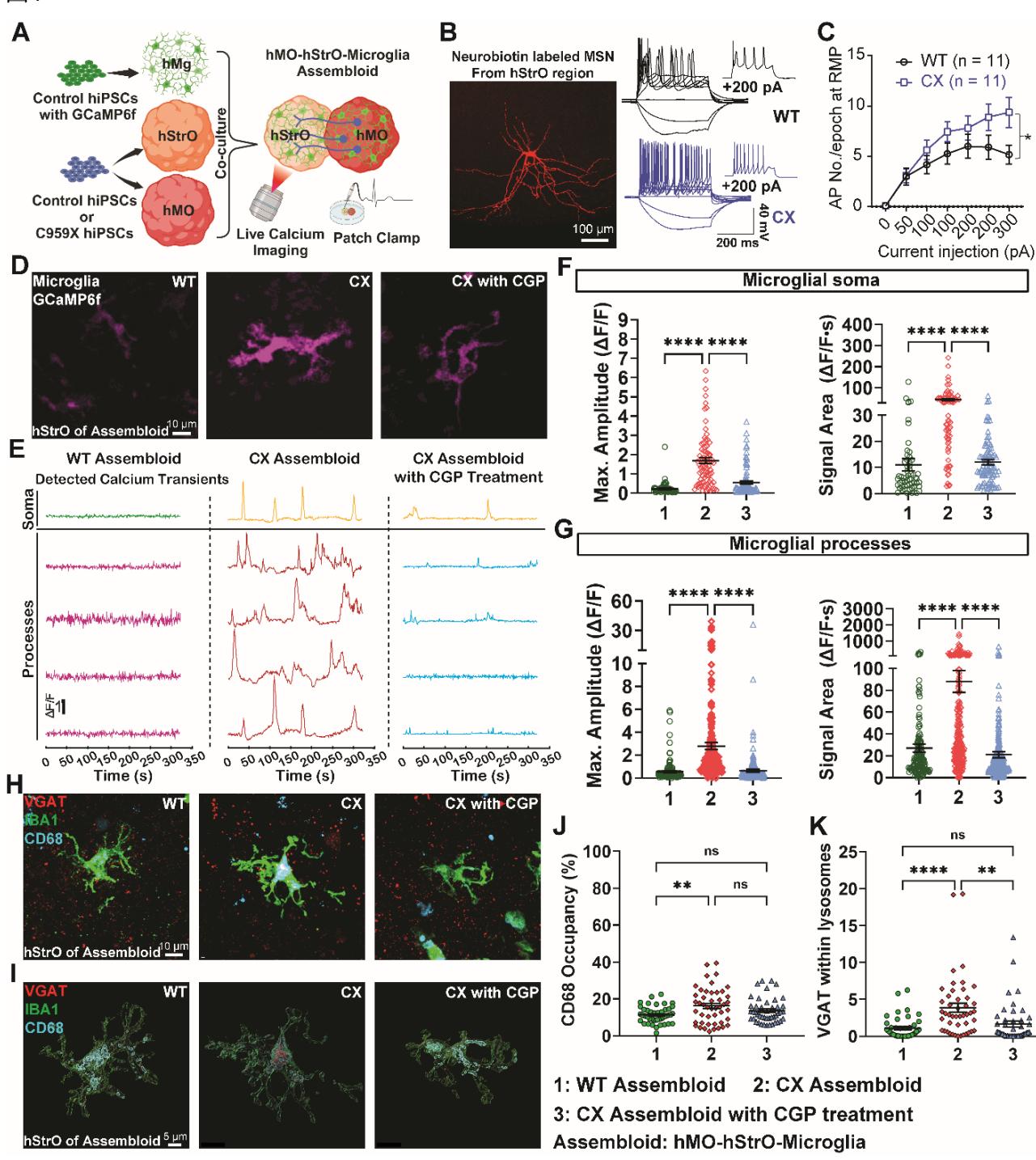 图 4. 小胶质细胞通过改变钙信号传导和过度修剪突触,对携带自闭症致病性 SCN2A 突变的过度兴奋的类组装体作出反应。(A) 发育中含小胶质细胞的 SCN2A C959X 突变类组装体示意图。(B) 神经生物素标记的典型中等多棘神经元(MSN)及各组MSN的代表性电流钳记录。比例尺:10 。(C)去极化电流脉冲诱发的平均动作电位(AP)数量。采用非配对双尾非参数曼-惠特尼U检验对各电流脉冲进行组间比较,每组 。 (***)。(D)各组(WT组、SCN2A C959X突变组及SCN2A组)hMO-hStrO-小胶质细胞组装体hStrO区的小胶质细胞钙活动(GCaMP6f)C959X突变体与CGP组。(E) 各组小胶质细胞钙瞬变的代表性 检测结果。(F) 不同组别小胶质细胞胞体钙信号最大振幅与信号面积的量化分析。WT类组装体: 个胞体/15个类组装体;CX类组装体: 个胞体/20个类组装体; 组: 个胞体/20个类组装体。单因素方差分析, 。(G) 不同组别小胶质细胞突触钙信号最大振幅与信号面积的量化分析。WT类组装体: 个突触/15个类组装体;CX类组装体: 个突触/20个类组装体; 组: 个突触/20个类组装体。单因素方差分析, 。(H与I) 各组代表性三重染色图像(VGAT、IBA1与CD68)(H)及Imaris重构图像 。比例尺: 。(J与K) 各组CD68阳性占比 (J)及溶酶体内VGAT的量化分析 。WT类组装体: 个细胞/9个类组装体;CX类组装体: 个细胞/9个类组装体; 组: 个细胞/9个类组装体。单因素方差分析, , ,ns:无显著性差异。