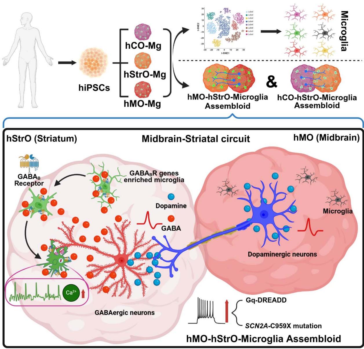 小胶质细胞对神经元环路的发育和功能具有关键塑形作用,但其在人脑不同环路中的区域特异性特征与功能仍不明确。本研究通过构建融合人源小胶质细胞的区域特异性脑类器官(皮质、纹状体、中脑),填补了这一重要空白。单细胞RNA测序揭示了六种具有独特区域标志的小胶质细胞亚型,其中一种亚型在纹状体类器官中高度富集GABAB受体基因。为探究小胶质细胞对神经环路的贡献,我们创建了整合小胶质细胞的中脑-纹状体组装体,模拟了自闭症等神经精神疾病的核心环路节点。通过化学遗传学激活该环路,我们观察到小胶质细胞中涉及GABA 受体的钙信号活动增强。利用该模型,我们进一步研究了在携带SCN2A无义突变(C959X)的神经环路中小胶质细胞的反应——该突变与重度自闭症相关。值得注意的是,小胶质细胞对SCN2A突变介导的神经元过度活跃表现出增强的钙响应,并参与过度的突触修剪。这些病理效应可通过药物抑制小胶质细胞GABA受体得到逆转。我们的研究共同建立了一个先进平台,用于解析皮层下区域的人类神经免疫互作机制,突显了小胶质细胞在塑造神经精神疾病相关关键环路中的重要作用。