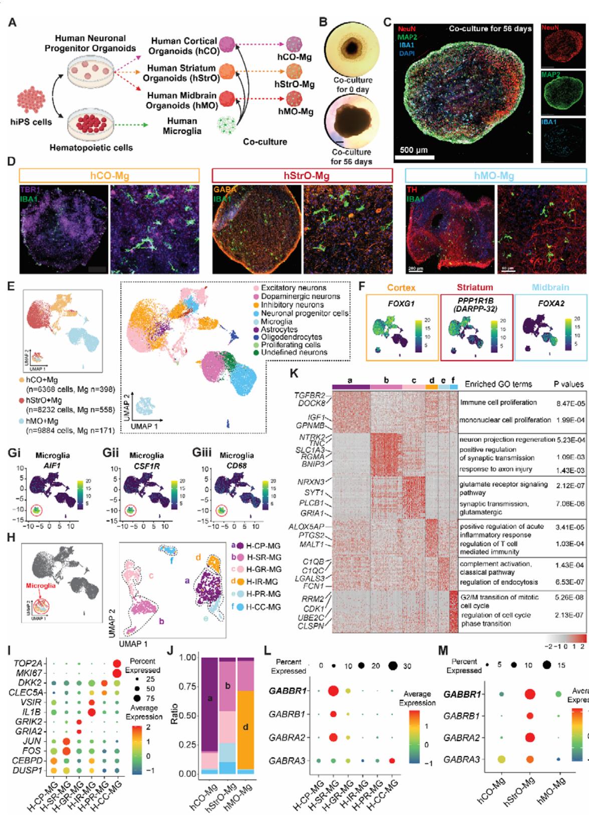 图1:hCO-Mg、hStrO-Mg和hMO-Mg模型揭示了不同人脑类器官中空间分布各异的小胶质细胞异质性。(A) 生成包含小胶质细胞的三维人皮质类器官(hCO-Mg)、人纹状体包含小胶质细胞的人纹状体类器官( )以及包含小胶质细胞的人中脑类器官(hMO-Mg)。 (B) 纹状体类器官与小胶质细胞共培养0天和56天的代表性明场图像。比例尺: 。 © 纹状体类器官与小胶质细胞共培养56天后的代表性四重染色图像(NeuN、Map2、IBA1和DAPI)。比例尺: 。 (D) hCO-Mg(TBR1和IBA1)、 (GABA和IBA1)和hMO-Mg(TH和IBA1)的代表性图像。全尺寸图像(0.5倍)比例尺: ,放大图像(20倍)比例尺: 。(E) 整合的hCO-Mg、hStrO-Mg和hMO-Mg的均匀流形逼近与投影(UMAP)图。 (F和G) 大脑皮质标记物FOXG1、纹状体标记物PPP1R1B、中脑标记物FOXA2以及(Gi-Giii)小胶质细胞标记物AIF1、CSF1R和CD68的UMAP可视化。 (H) 分为6个簇的小胶质细胞的UMAP可视化。H:人,MG:小胶质细胞,CP:细胞增殖,SR:刺激反应,GR:谷氨酸相关反应,IR:免疫反应,PR:修剪反应,CC:细胞周期。 (I) 点图显示每个小胶质细胞簇选定标记物的百分比。 (J) 小胶质细胞簇在不同脑区类器官模型中的分布。 (K) 热图展示各小胶质细胞簇的前50个基因。左侧突出显示与主要类型相关的差异基因,右侧为富集的基因本体论术语。 (L和M) 点图显示GABA受体基因在(L)不同小胶质细胞簇及(M)不同脑区类器官小胶质细胞中的百分比与平均表达量。