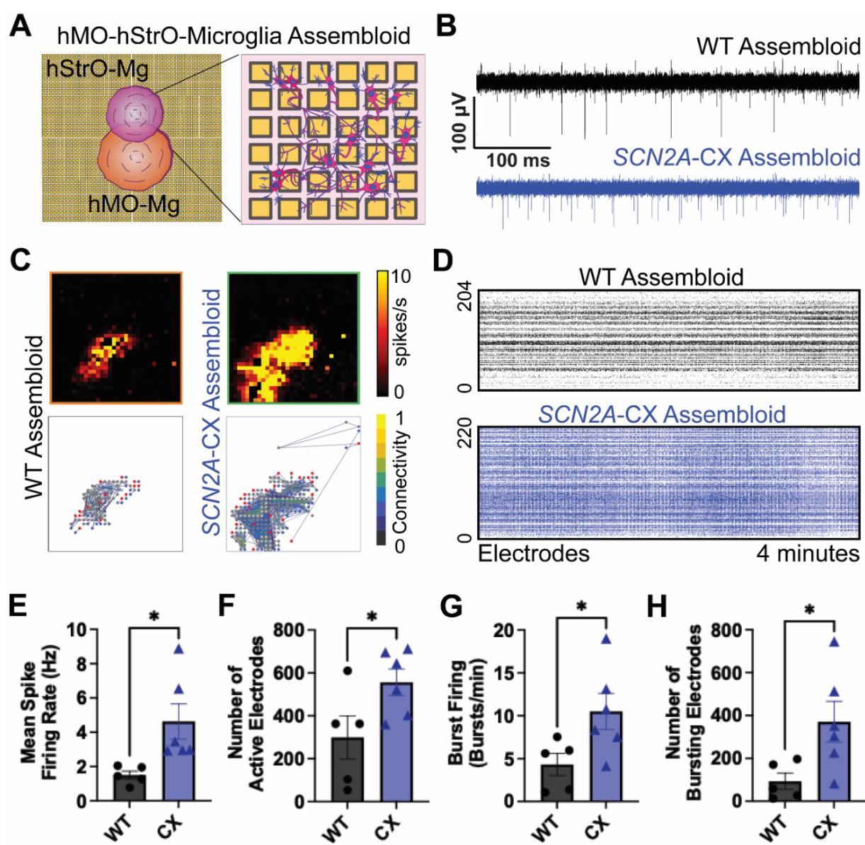 s-图4. SCN2A-C959X导致hMO-hStrO-小胶质细胞类组装体出现网络过度兴奋。(A) 共培养系统示意图,显示中脑类器官(橙色)和纹状体类器官(粉色)接种于高密度微电极阵列上(插图显示单个电极及互连的放大视图)。(B) 单个电极记录到的野生型组(黑色)和SCN2A C959X突变组(蓝色)的原始电压迹线示例;注意SCN2A C959X突变组的放电频率增加。© 通过HD-MEA在野生型组和SCN2A C959X突变组中记录到的尖峰活动代表性热图(尖峰数/秒)(上图)和代表性神经元连接图(下图)。(D) 野生型组(黑色)和SCN2A C959X突变组(蓝色)网络中,汇总自~424个电极的尖峰栅格图,时间跨度为4分钟。每行代表一个电极;每个标记点代表一个检测到的尖峰。(E) 平均尖峰发放频率(赫兹)的量化。(F) 野生型组与SCN2A C959X突变组中“活跃”电极的数量。(G) 簇状放电频率(簇/分钟)。(H) “簇状放电”电极的数量,定义为显示簇状放电活动的电极。E-H,野生型组n 个类组装体,CX组 个类组装体。非配对t检验,条形图显示均值± SEM; )。