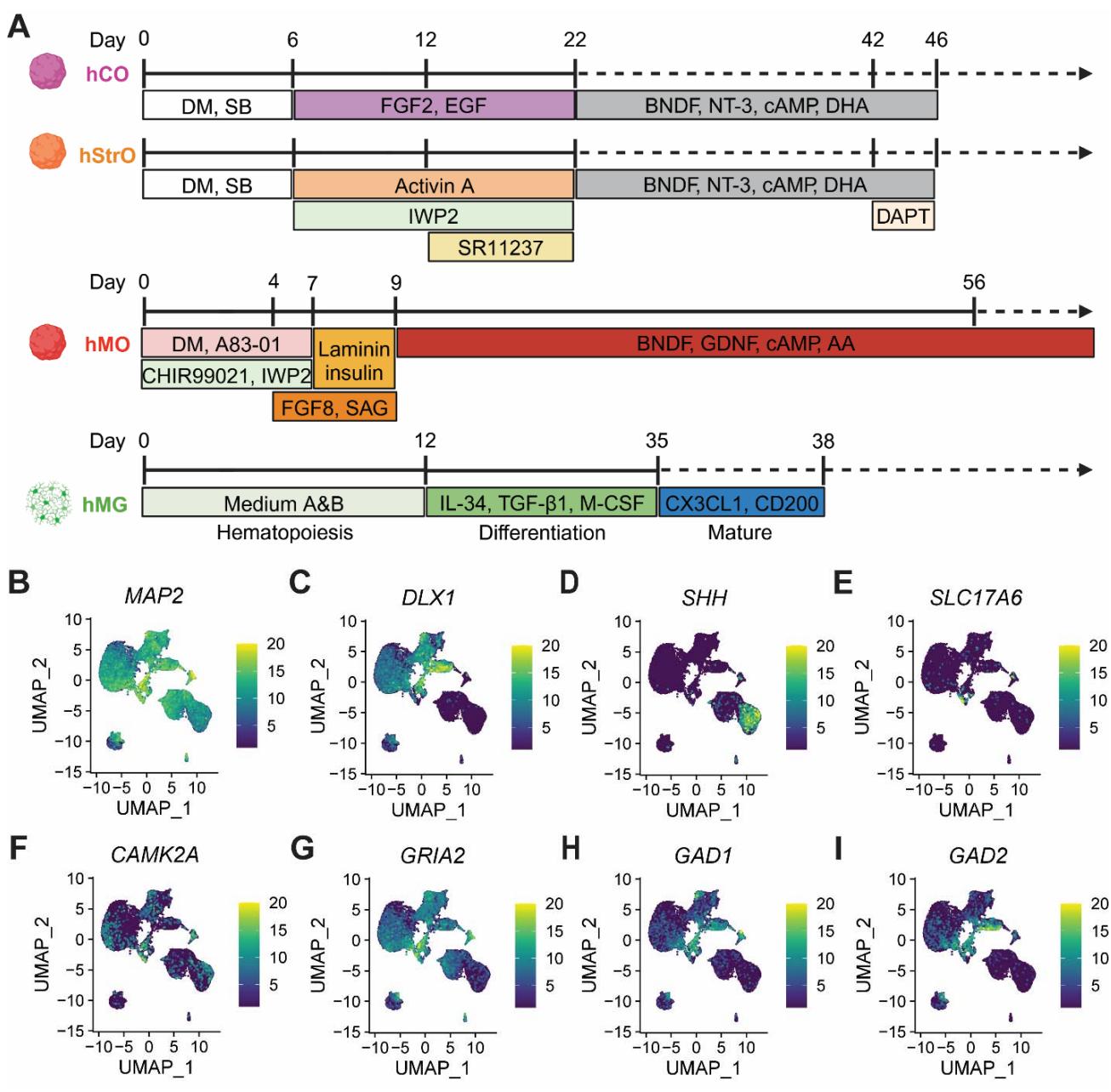 s-图1. 小胶质细胞整合的大脑区域特异性类器官的实验方案及单细胞分析。 不同人脑类器官模型的分化方案示意图。hCO(人皮层类器官)、 (人纹状体类器官)、hMO(人中脑类器官)、hMG(人小胶质样细胞)。 展示不同类器官模型中各细胞群体关键标志基因表达的UMAP图谱。 MAP2:泛神经元标志物,在分化神经元中富集。 DLX1:GABA能中间神经元标志物,提示纹状体及抑制性神经元特征。 SHH:Sonic hedgehog信号通路,对中脑及腹侧前脑模式形成至关重要。 SLC17A6(VGLUT2):兴奋性谷氨酸能神经元标志物。 CAMK2A:兴奋性皮层投射神经元的突触后标志物。 GRIA2:AMPA受体亚基,提示兴奋性神经传递。 GAD1:参与γ-氨基丁酸合成的酶,标记抑制性GABA能神经元。 GAD2:另一种γ-氨基丁酸合成酶,标记抑制性中间神经元。