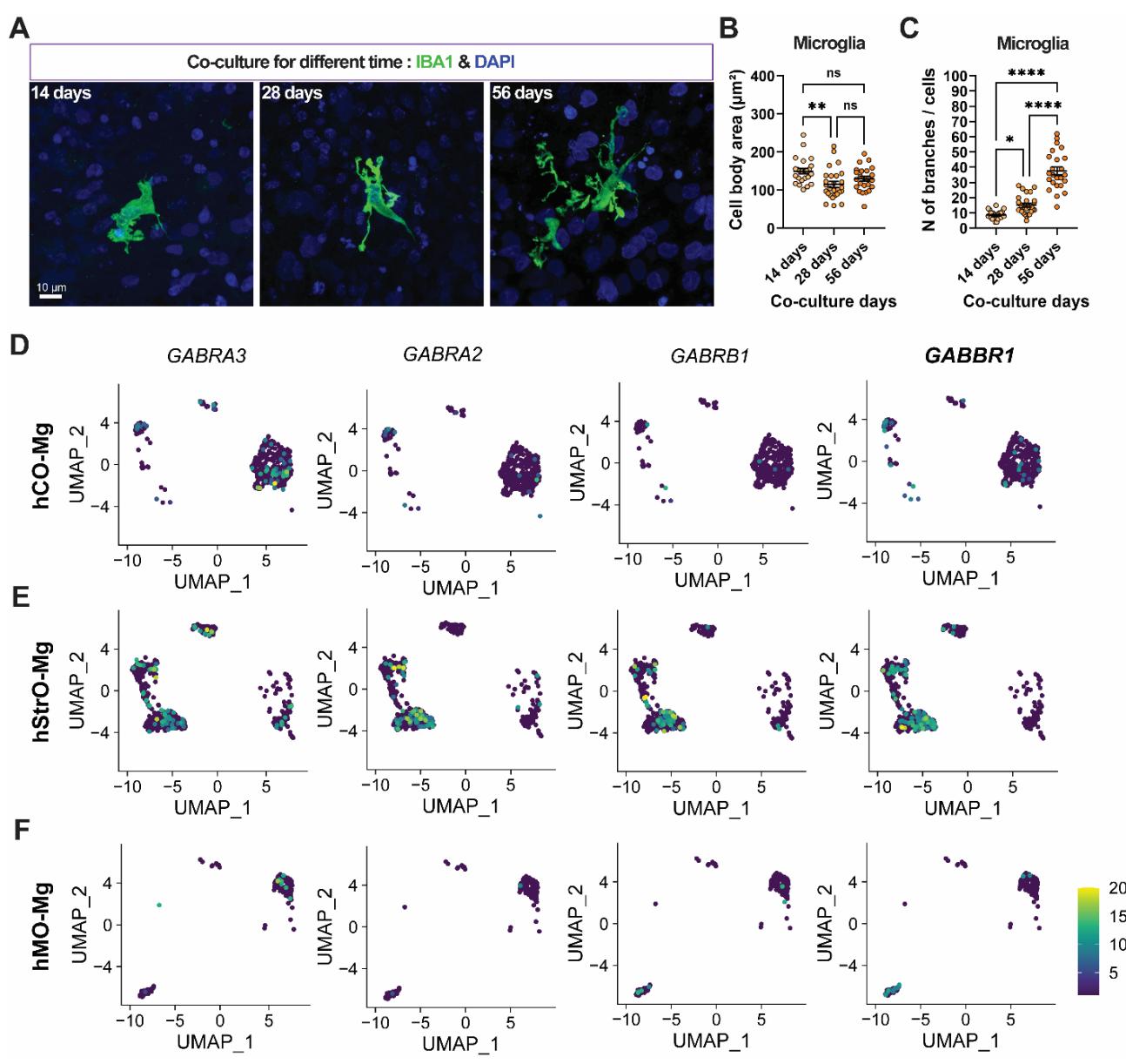 s-图2. 纹状体小胶质细胞的成熟度随共培养时间延长而增加,及其GABA相关受体基因的分布。(A) 组中随共培养时间增加的代表性小胶质细胞形态。比例尺: 。(B和C)各组小胶质细胞胞体面积和分支数量的量化。共培养时间:14天组: 个细胞/12个类器官;28天组:n 个细胞/12个类器官;56天组: 个细胞/12个类器官。单因素方差分析, (*), 0.01(**), (***), (****),ns:无显著性。(D)hCO-Mg单细胞RNA测序分析中,小胶质细胞UMAP内GABA受体相关基因的表达与分布。(E) 单细胞RNA测序分析中,小胶质细胞UMAP内GABA受体相关基因的表达与分布。(F)hMO-Mg单细胞RNA测序分析中,小胶质细胞UMAP内GABA受体相关基因的表达与分布。