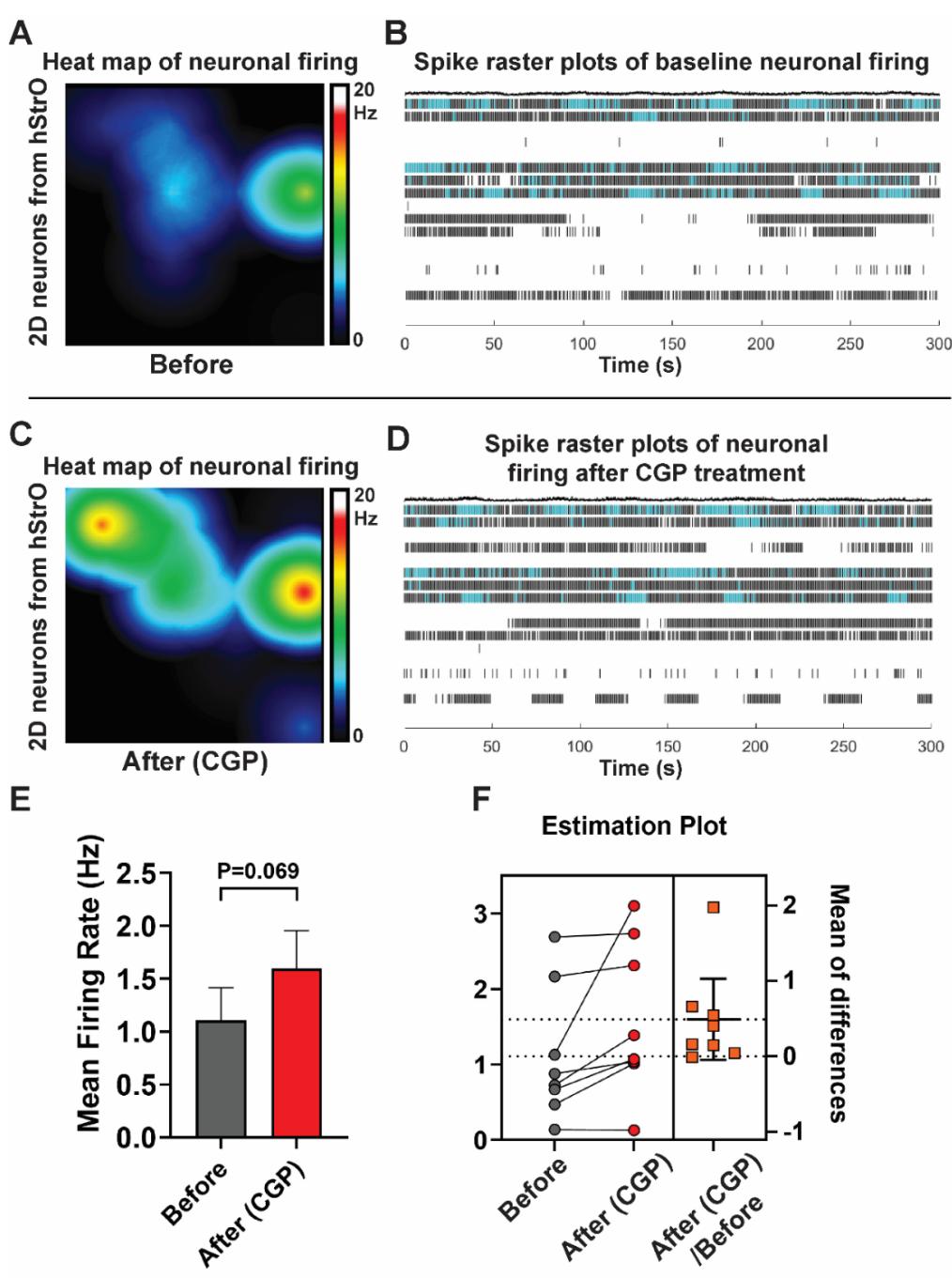 s-图3. CGP处理仅对神经元兴奋性产生有限影响。(A和C)神经元放电的代表性热图,包括CGP处理前(A)和后©。(B和D)代表性的峰电位点阵图,包括CGP处理前(B)和后(D)。每行对应单个电极在300秒内记录的神经元峰电位,每个刻度标记代表一次自发事件。爆发事件由蓝色高亮的刻度簇表示。(E)CGP处理前后平均放电频率(MFF)的量化比较。 个孔。配对Student’s t检验, 。(F)左图:MEA记录显示的神经元平均放电频率(含CGP处理前后)。右图:受试者内差异,实心水平线代表差异均值。