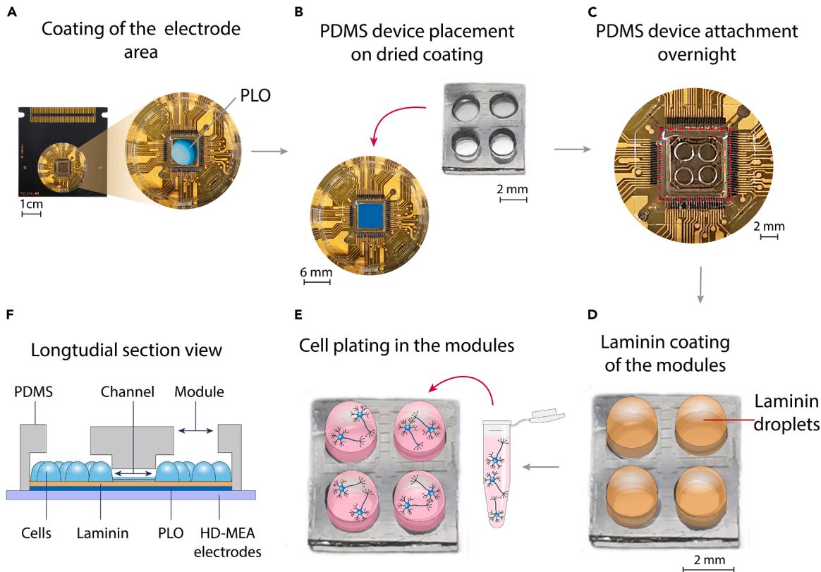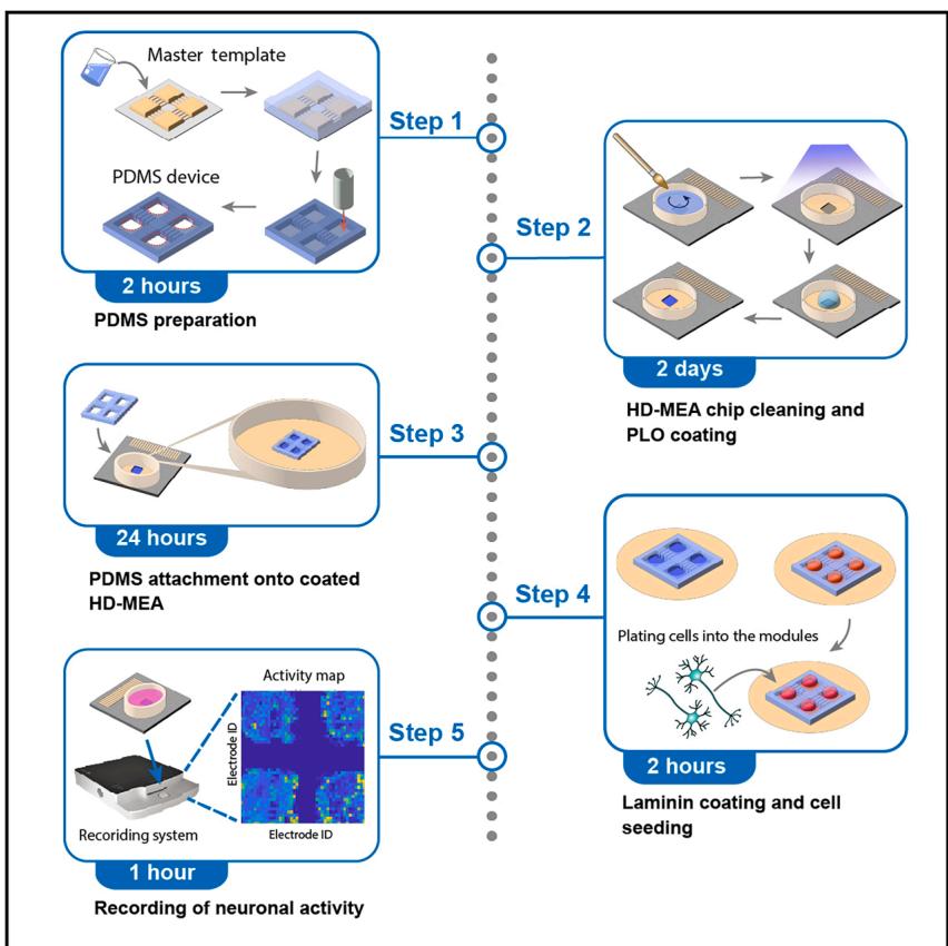 鉴于 HD-MEA 芯片具有敏感性高、成本高且需复用的特点,优化其操作方法至关重要。因此,本研究旨在提供一套具有适应性与可重复性的方案,并包含替代方法与通用指南,以实现:(1)设计并制备适配特定 HD-MEA 芯片的 PDMS 微结构(“微加工器件”);(2)将这些微结构集成到 HD-MEA 表面;(3)建立延长芯片寿命、提升复用率的清洗流程。