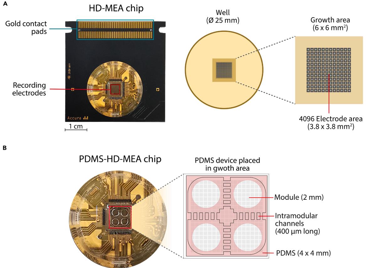 (A)标准芯片结构,包含 CMOS 传感器所在的培养孔区域及连接记录系统的接触垫。培养孔细节图显示 64×64 电极阵列,用于记录表面生长细胞的膜场电位。(B)电极区上方放置 PDMS 浇筑件的芯片(已准备好进行细胞培养)。PDMS 结构包含 4 个打孔腔室(模块),用于神经元接种;模块对通过 5 条平行微通道(400 μm 长)正交连接。
