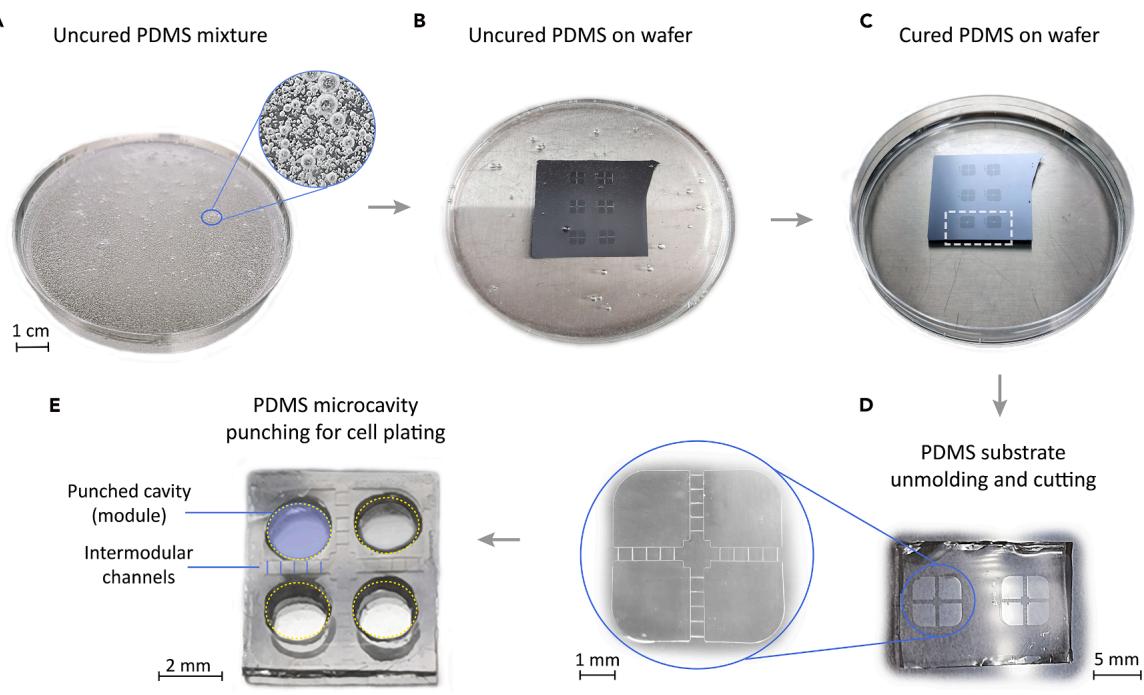 PDMS 浇筑件设计需适配 HD-MEA 芯片电极区,而手工放置和对准(尤其是打孔以实现细胞接触)难度大 —— 微孔间距难以一致,导致腔室空间布局差异,进而影响模块间轴突长度和互联性,降低实验可重复性(参见 “PDMS 制备与清洗” 步骤 8)。