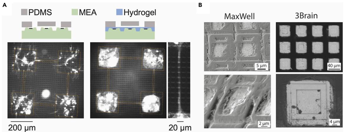 (A) MaxWell HD-MEA芯片上PDMS微结构的集成,使用荧光染料(NeuO)对β-III微管蛋白进行染色,以显示无水凝胶涂层(左)和有水凝胶涂层(右)条件下神经突的生长情况。右侧面板展示了连接两个模块的微通道细节。经Sato等¹许可转载