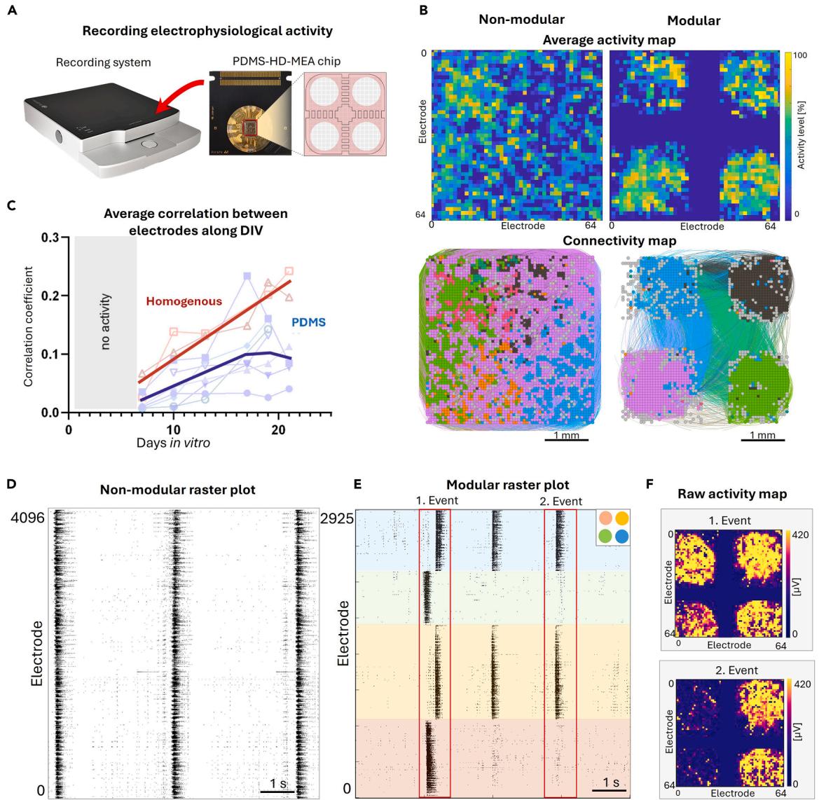 (A) 模块化网络示意图(上)及置于HD-MEA中的微加工PDMS(下)。