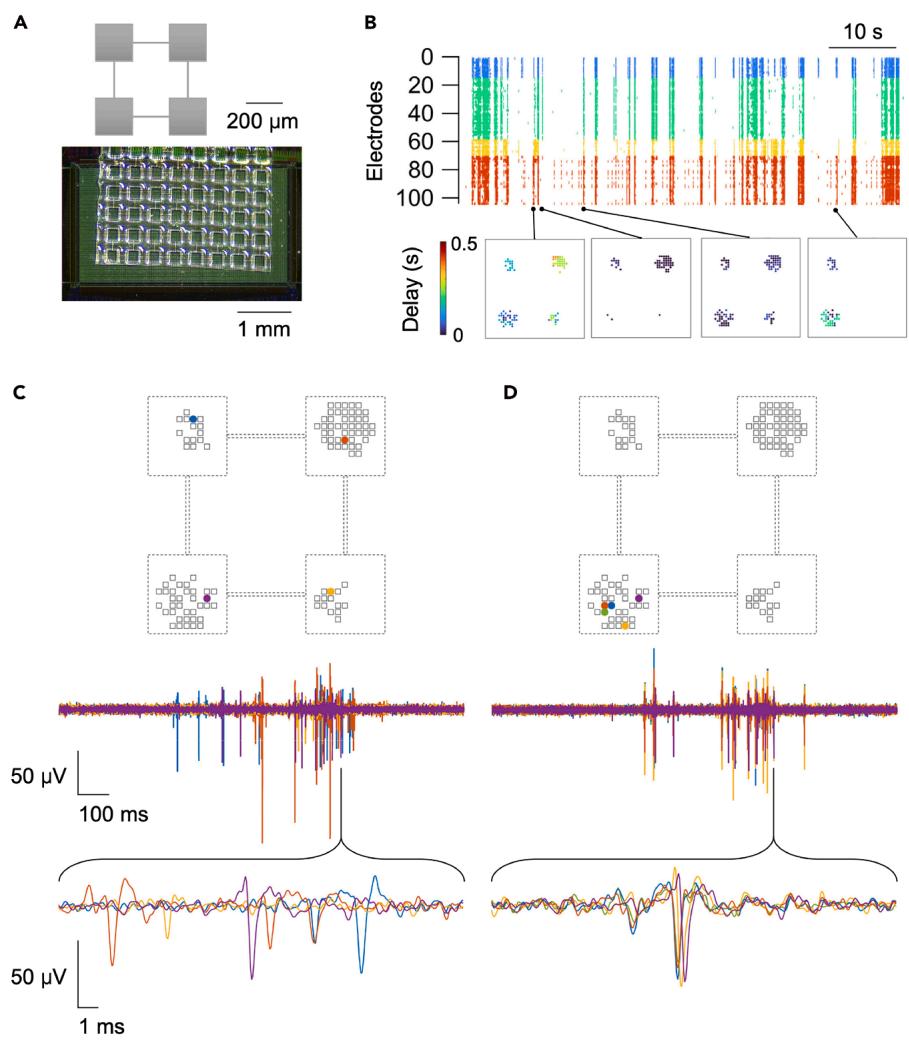 为验证网络结构对神经元动态的影响,研究在 3Brain 平台的 HD-MEA 芯片上对比了模块化与非模块化网络(图 4A):