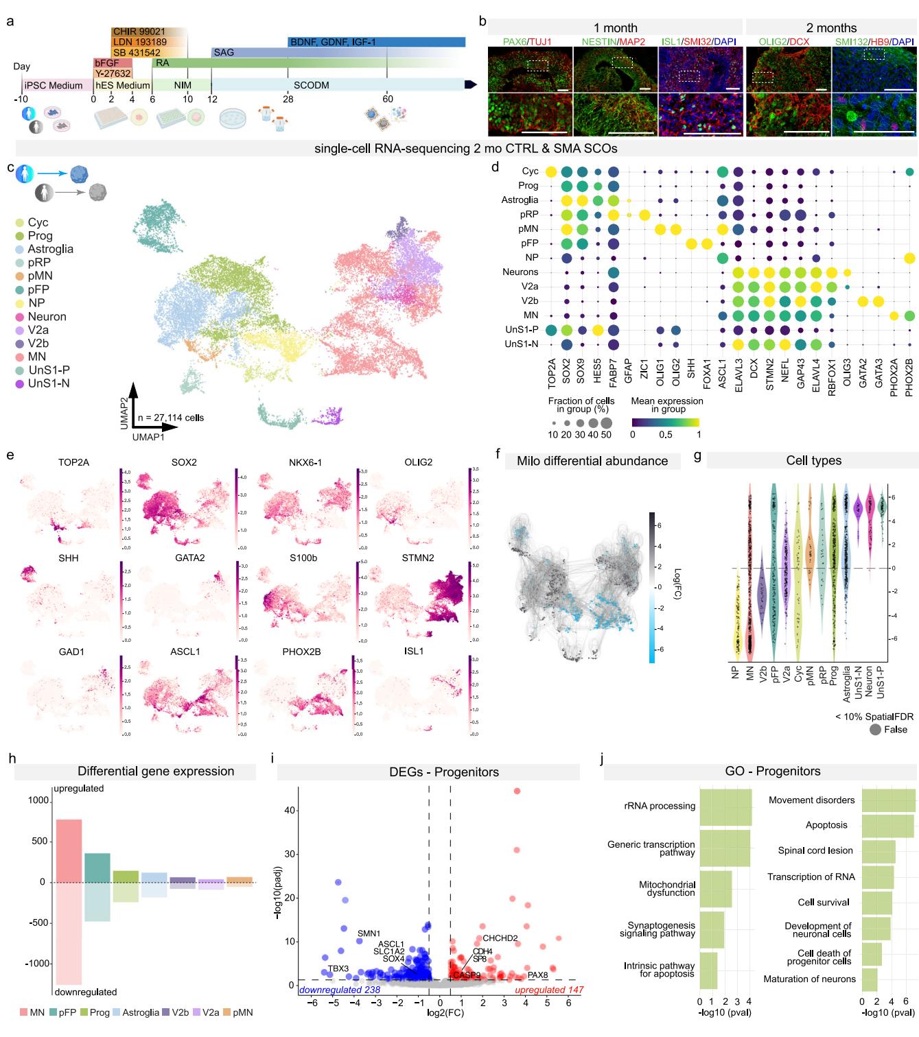 Rinchetti, P.(2025)https://BioRender.com/l7ay5hq。b 1个月和2个月时SCO中发育标志物和神经元标志物的免疫染色结果。SCO对神经发育标志物(包括PAX6、NESTIN和OLIG2,绿色)以及神经元标志物(如ISL1(绿色)、TUJ1、MAP2、SMI32和DCX,红色)呈阳性染色。此外,运动神经元通过HB9(红色)的阳性表达来指示。细胞核用DAPI(蓝色)染色。比例尺:100μm。代表性图像。每个批次至少对3个不同的类器官进行独立免疫染色,至少包含3个CTRL系和3个SMA系。c 来自C1、C3、S1和S3系的2个月(mo)时的CTRL和SMA单细胞RNA测序结果。无监督UMAP将SCO分为神经祖细胞( Cycling细胞(Cyc)、祖细胞(Prog)、星形胶质细胞、顶板祖细胞(pRP)、运动神经元祖细胞(pMN)、底板祖细胞(pFP)、神经源性祖细胞(NP))、分化中的神经元细胞(Neuron)、几种腹侧神经元亚型(V2a、V2b)、运动神经元(MN),以及一个独特的未匹配SMA细胞簇,该簇特别源自SMA S1系(未匹配S1祖细胞(UnS1-P)、未匹配S1神经元(UnS1-N))。d 点图显示与细胞分化相关的代表性基因的簇特异性表达;点的大小对应于簇中表达每个基因的细胞百分比,颜色对应于平均表达水平(从紫色到黄色,代表从低到高)。e UMAP特征图显示增殖因子(TOP2A和SOX2)、祖细胞标志物(NKX6-1、OLIG2、SHH、GATA2)和神经元分化标志物(STMN2、GAD1、PHOX2B和ISL1)的选定代表性基因的对数归一化计数。f Milo差异丰度测试结果的邻域抽象图。灰色表示SMA富集,蓝色表示CTRL富集。g 小提琴图显示分配给细胞类型标签的差异丰度邻域的对数倍变化分布。h 不同簇中失调基因的数量。i SMA SCO与CTRL相比,祖细胞簇中差异基因表达(DEG)的火山图。每个基因的log2倍变化值相对于−log10 q值作图。红色表示SMA中上调的基因,蓝色表示SMA中下调的基因(绝对对数倍变化≥0.2,最小百分比=0.25,调整后的q值<0.05,阈值用虚线标出)。j 使用QIAGEN Ingenuity Pathway Analysis(IPA)软件对祖细胞簇中上调和下调基因进行的选定基因本体论(GO)分析(采用Benjamini-Hochberg校正的Fisher检验)。