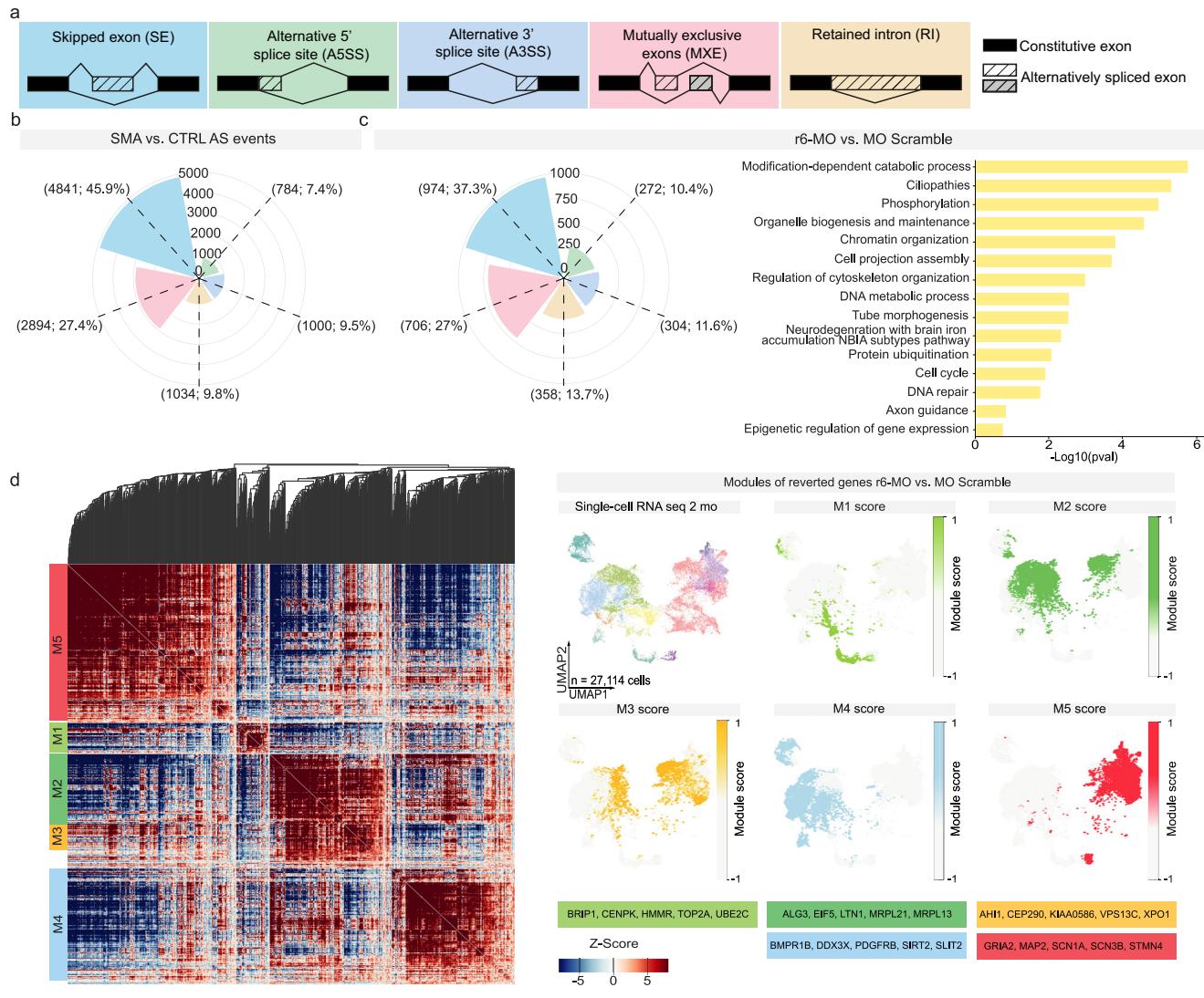 相比之下,对脊髓性肌萎缩症(SMA)与对照(CTRL)、r6-MO处理与r6-MO- scramble处理的SMA类器官中前体mRNA剪接模式的分析显示,不同条件下存在显著差异(图6a、b及补充图14d)。SMA脊髓类器官(SCOs)中SMN1的缺失(对比CTRL与SMA类器官)以及r6-MO处理对SMN的挽救作用(对比r6-scramble-MO与r6-MO)导致了多种显著的可变剪接变化。变化最显著的事件为外显子跳跃(SE)、互斥外显子(MXE),其次是内含子保留(IR)、可变3’剪接位点(A3SS)和可变5’剪接位点(A5SS)事件,这些事件的检测频率较低(补充数据7)。 为评估r6-MO处理对SMA细胞剪接图谱的影响,我们将r6-MO处理的SCOs与r6-scramble-MO(基线对照)处理的细胞中的前体mRNA剪接事件进行了比较。r6-MO特异性修饰了共计2614个剪接事件(图6c及补充数据8)。其中数量最多的是SE、MXE和IR,其比例与CTRL和SMA对比中观察到的比例相似。我们鉴定出1982个与这2614个挽救性剪接事件特异性相关的基因(补充数据8)。对这些基因的基因本体富集分析显示,它们在染色质组织调控、DNA代谢过程、细胞周期以及轴突导向和神经退行性变等方面显著富集(图6c)。 重要的是,剪接事件的变化可与单细胞RNA测序分析中的特定基因模块相匹配(图6d)。我们利用所有检测到的挽救性剪接基因进行模块评分分析,揭示了与以下细胞类型特异性相关的剪接基因的独特组合:循环细胞(M1:BRIP1、CENPK、HMMR、TOP2A、UBE2C)、祖细胞(M2:ALG3、EIF5、LTN1、MRPL21、MRPL13)、祖细胞和神经元(M3:AHI1、CEP290、KIAA0586、VPS13C、XPO1)、星形胶质细胞(M4:BMPR1B、DDX3X、PDGFRB、SIRT2、SLIT2)以及运动神经元(MN)细胞类型(M5:GRIA2、MAP2、SCN1A、SCN3B、STMN4)(图6d)。