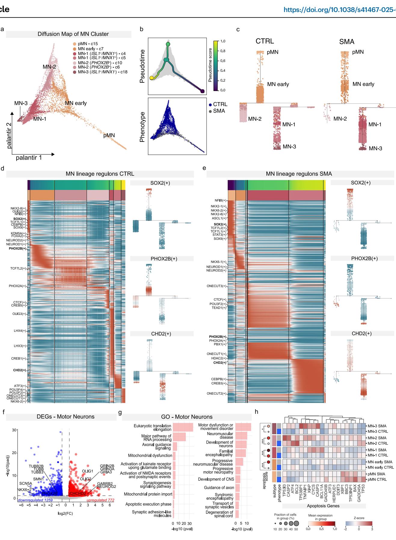 图3 | SMA SCOs显示疾病的分子特征。a 运动神经元(MN)集群的扩散图(DM),按亚集群特征着色。b 上图:按拟时间评分着色的扩散图。下图:按样本表型(CTRL,SMA)着色的扩散图。c CTRL和SMA样本的运动神经元在拟时间轨迹上的投影。细胞按亚集群特征着色,以显示其沿轨迹的分布。d、e 热图显示与CTRL(d)和SMA(e)轨迹相关的调节子活性趋势和拟时间,按每个亚集群特征分箱。CTRL和SMA样本中SOX2、PHOX2B和CHD2的调节子活性评分。调节子活性高的以红色表示,活性低的以蓝色表示。f 与CTRL相比,SMA SCOs中运动神经元集群的差异基因表达(DEG)火山图。每个基因的log2倍变化值与q值的−log10作图。红色表示SMA中上调的基因,蓝色表示SMA中下调的基因(绝对log倍变化≥0.2,最小百分比=0.25,校正q值<0.05,阈值以虚线绘制)。g 使用QIAGEN Ingenuity通路分析(IPA)软件对运动神经元中上调和下调基因进行的选定基因本体论(GO)分析(采用Benjamini–Hochberg校正的Fisher检验)。h 左图:显示凋亡模块评分表达的点图。右图:不同运动神经元亚集群和表型中凋亡相关基因表达的热图。