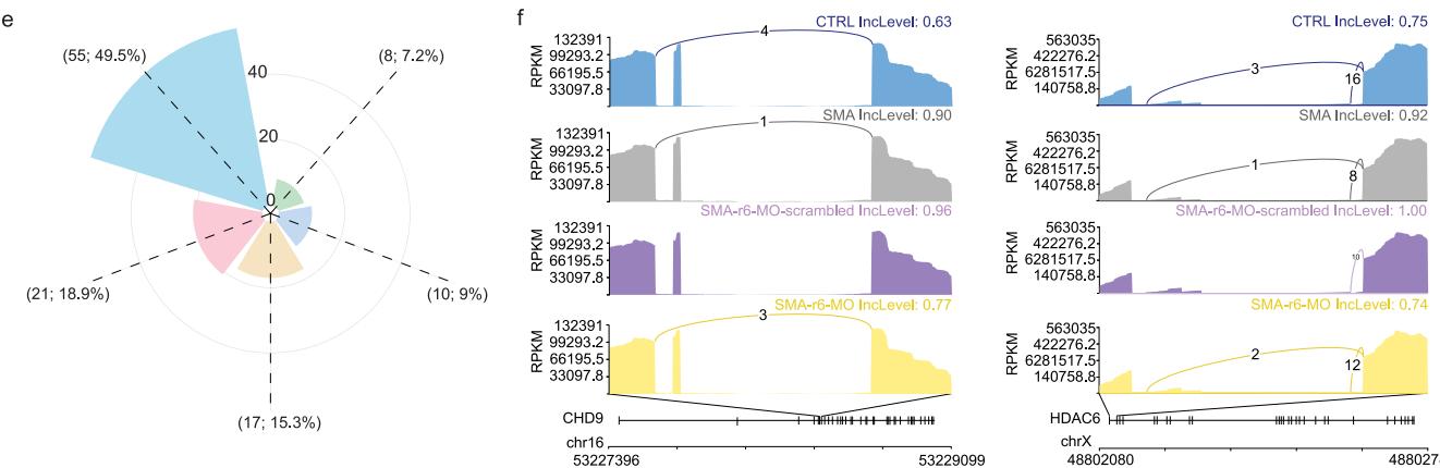 在获救基因中,我们重点关注了CHD9(染色质域解旋酶DNA结合蛋白9)——它是胚胎干细胞中细胞周期的关键调节因子³⁸,以及HDAC6(组蛋白去乙酰化酶6)——其通过在轴突运输、自噬促进和神经保护中的作用,对运动神经元的发育和功能至关重要³⁹,⁴⁰(图6f,剪接示意图)。这些发现表明,获救的剪接事件会影响对祖细胞和神经元发育至关重要的多种细胞和分子过程,从而推动r6-MO处理后观察到的功能恢复。