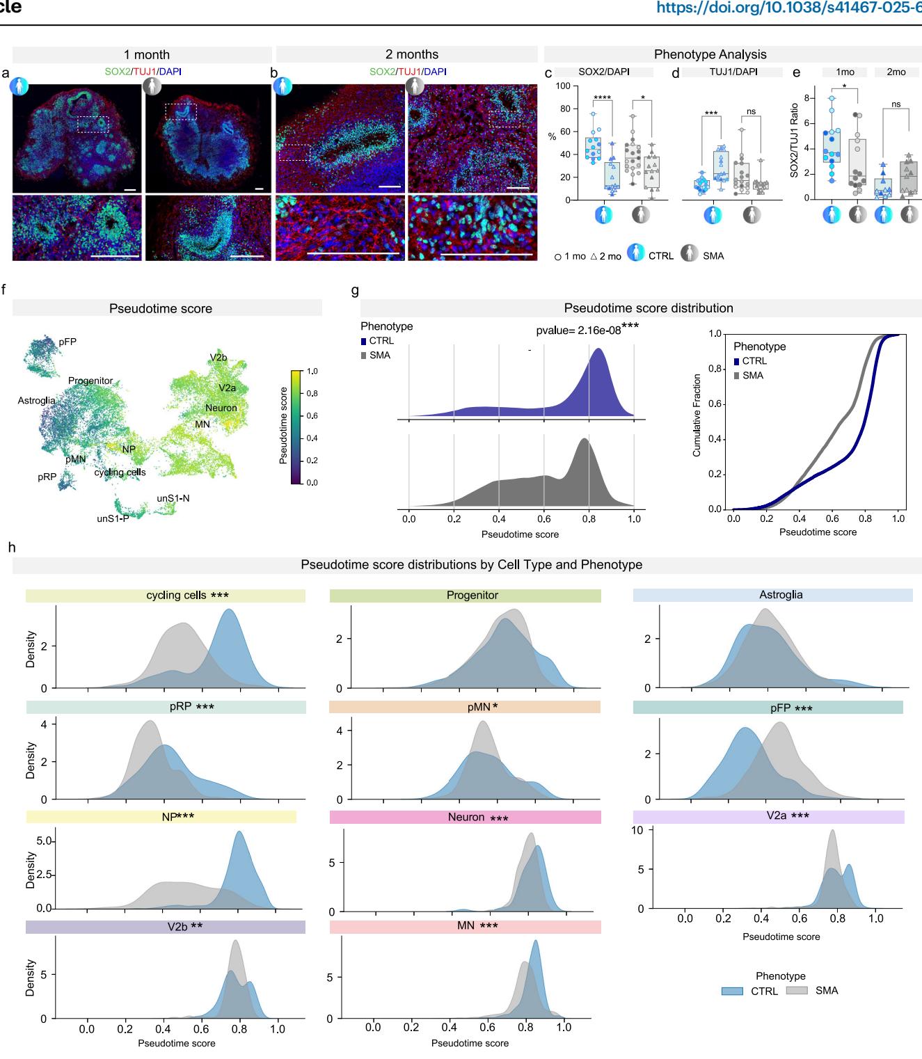 图2 | SMA类脊髓器官(SCOs)的神经发育疾病特征。a、b 对照组(CTRL)和SMA类脊髓器官在1个月和2个月时SOX2(绿色)和TUJ1(红色)染色的代表性图像。比例尺:200 μm。细胞核用DAPI(蓝色)染色。c SOX2阳性细胞的定量分析(占DAPI染色显示细胞的百分比),分别在1个月(圆圈)和2个月(三角形)(双因素方差分析,Sidak多重比较检验:对照组和SMA的p值分别为<0.0001和0.0148。来自30天和60天对照组类脊髓器官的样本数n=28:n=4 C1、n=4 C2、n=3 C4、n=3 C5;n=8 C1、n=3 C4、n=3 C5;来自30天和60天SMA类脊髓器官的样本数n=33:n=4 S1、n=7 S2、n=6 S4、n=2 S5;n=5 S2、n=4 S3、n=5 S4)。箱线图显示系列中的最小值和最大值,以及中位数和第25-75百分位数。d 在对照组中,TUJ1的表达随时间增加,而在SMA类脊髓器官中,TUJ1的表达有下降趋势(双因素方差分析,Sidak多重比较检验:对照组和SMA的p值分别为0.0002和0.0764。来自30天和60天对照组类脊髓器官的样本数n=33:n=4 C1、n=5 C2、n=3 C3、n=3 C4、n=3 C5;n=4 C1、n=3 C2、n=3 C3、n=3 C4、n=2 C5;来自30天和60天SMA类脊髓器官的样本数n=33:n=4 S1、n=2 S2、n=4 S3、n=6 S4、n=2 S5;n=4 S1、n=3 S2、n=3 S3、n=5 S4)。e 堆叠条形图显示对照组和SMA类脊髓器官在1个月和2个月时SOX2与TUJ1的比例(Mann-Whitney检验:1个月和2个月时对照组与SMA相比,p值分别为0.0444和0.1734。来自30天和60天对照组类脊髓器官的样本数n=24:n=4 C1、n=4 C2、n=3 C4、n=3 C5;n=5 C1、n=3 C4、n=2 C5;来自1个月和2个月SMA类脊髓器官的样本数n=25:n=4 S1、n=2 S2、n=6 S4、n=2 S5;n=3 S2、n=3 S3、n=5 S4)。f UMAP图显示按伪时间分数着色的细胞,并标注主要细胞类型。g 左图:对照组(蓝色)和SMA(灰色)细胞中伪时间分数分布的密度图(双侧Kolmogorov-Smirnov(KS)检验,p=2.16e-08)。右图:对照组和SMA细胞中伪时间分数的累积分布图。h 各细胞类型伪时间分数的密度图,比较对照组(蓝色)和SMA(灰色)。使用双侧KS检验评估伪时间分布的显著差异。星号表示显著性水平:*p<0.05,**p<0.01,***p<0.001,****p<0.0001。源数据作为源数据文件提供。