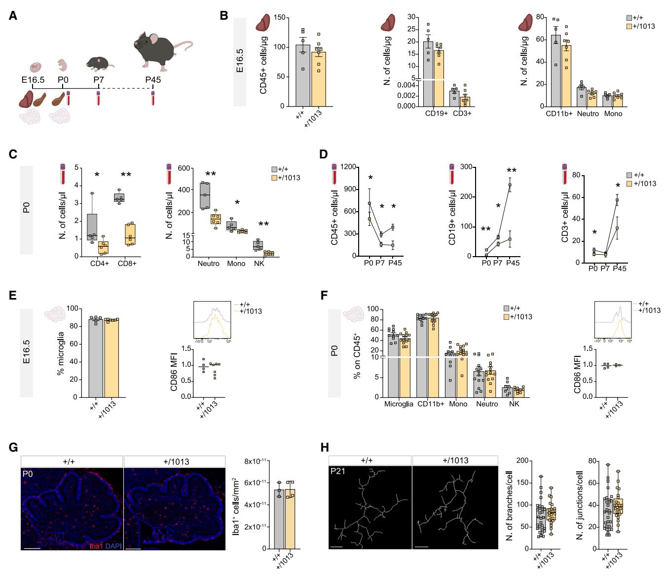 所有实验均按照欧洲共同体理事会(2010年9月22日第2010/63/EU号指令)和意大利第26/2014号法令确立的指南进行。该研究已获得Humanitas研究医院的机构动物护理和使用委员会(IACUC)以及意大利卫生部的批准。小鼠被饲养在特定无病原体(SPF)设施中,环境温度恒定(22±1℃),湿度为50%,光照/黑暗周期为12小时,可自由获取食物和水。SPF条件确保动物从未接触过免疫挑战。WHIM相关突变体Cxcr4+/1013敲入小鼠由Arenzana-Seisdedos教授慷慨提供,最初在巴斯德研究所生成,并饲养在C57BL/6J背景下。实验组包括从胚胎第16.5天(E16.5)到出生后第45天(P45)的同窝小鼠。在所有测量参数中均未观察到基于性别的差异。除成年行为测试仅使用年龄匹配的同窝雄性小鼠外,所有实验的结果均汇总了不同性别的数据。