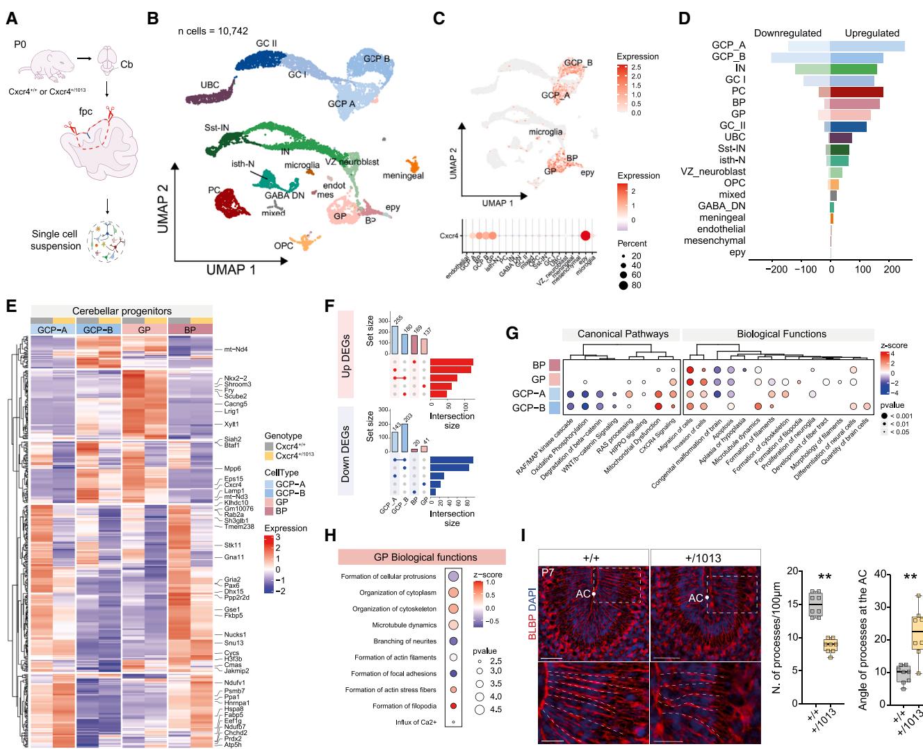 为了研究Cxcr4+/1013小鼠中观察到的异常叶片形成所涉及的细胞和分子基础,我们对P0期Cxcr4+/1013小鼠和对照组的显微切割小叶LIII-VI-V进行了单细胞RNA测序(图4A)。通过对10742个细胞进行分析(这些细胞在不同基因型间呈比例分布,图S5A-S5C),我们进行了无监督聚类,发现了26个聚类,它们被归为19种不同的细胞类型(图4B和图S5A-S5C)。与最近发表的数据集一致,我们识别出了颗粒前体细胞(GPC,标志物:Top2a、Mki67和Cxcr4)、双能前体细胞(BP,标志物:Glis3、Sox2和Pax3)、神经胶质生成前体(GP,标志物:Tnc、Slc4a4、Apoe和Aldh1l1)以及室管膜前体(epy,标志物:Spag17、Foxj1和Tmem212)。 我们还描绘了不同的兴奋性小脑神经元类型,包括单极刷细胞(UBC,富含Kirrel3、Eomes、Lmx1a)和颗粒细胞(GC,表达Reln、Neurod1、Eps8、St18)。发现了分子水平上不同的颗粒细胞前体亚群(GCP-A Top2a+和GCP-B Mfap4+)以及颗粒细胞亚群(GCI Neurod1+和GCII Cadps2+)。至于抑制性细胞类型,我们识别出了浦肯野细胞(PC,由Pcp2、Calb1标记)和中间神经元(IN,Gad1/2、Pax2、Slc6a5),包括表达生长抑素(Sst)的中间神经元亚群。此外,还识别出了峡部的神经元群体(峡部是小脑 和中脑之间的边界区域,峡部神经元,isth-N,富含Lhx9、Otx2和Asic4)以及小脑深部核团的γ-氨基丁酸能神经元(γ-aminobutyric acid [GABA] DN,富含Sox14、Gad1/2)。同时,还捕获到了非神经元细胞群体和中胚层衍生的细胞类型,包括小胶质细胞(Cx3cr1、Trem2)、血管细胞(Cldn5、Flt1、Cdh5和Pecam1)、脑膜内皮细胞(Cxcl12和Vtn)以及间充质细胞(Col1a1、Col3a1和Dcn)。