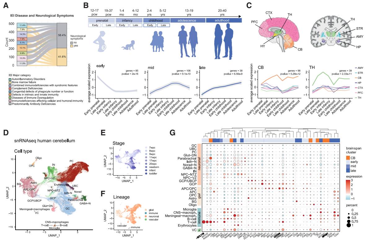 为了探究人类大脑中与原发性免疫缺陷(IEI)相关的基因表达,我们首先利用一个经过验证的分类系统(https://www.niaid.nih.gov/diseases-conditions/types-IEI,来源:国际免疫学会联盟,IUIS),整理出了526种遗传性IEI及其对应的444个致病基因。27,28随后,我们利用BrainSpan发育转录组65和单核RNA测序66数据集来分析基因表达模式。