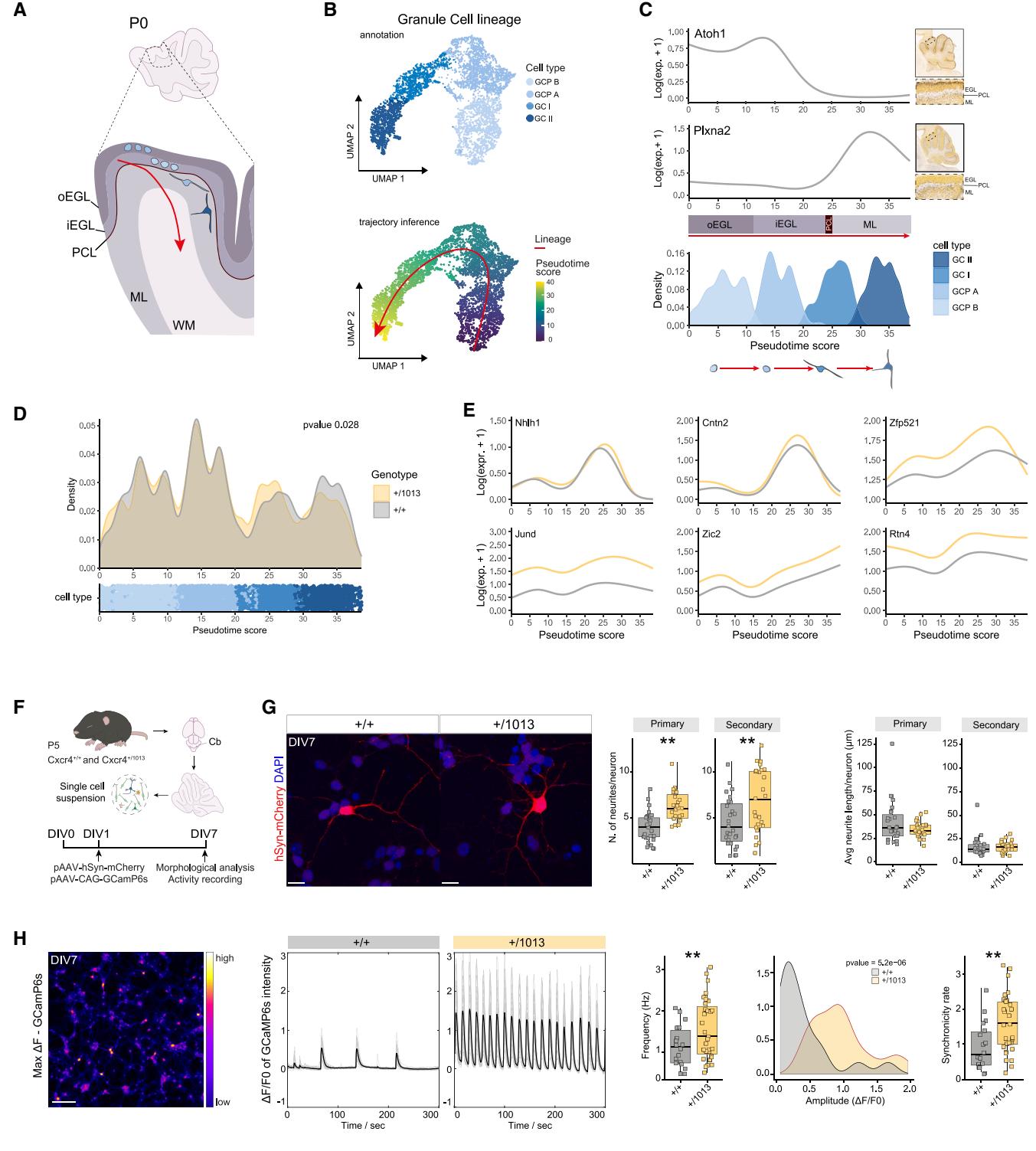 鉴于在GCP中观察到的转录变化,我们研究了GCP衍生物(即成熟GCs,图5A)的分化和成熟是否在WHIM小鼠中受到影响。我们通过推断轨迹拓扑结构并进行伪时间分析,研究了颗粒细胞谱系的发育路径(图5B)。我们确定了GCP-B是一个共同的起点(根)——该集群的熵值最高,意味着分化水平最低97(图S5E)——轨迹从这里经过GCP-A和GCI,最终终止于GCII(图5B、5C和S5F)。在Cxcr4+/1013小鼠和对照组之间,未观察到谱系拓扑结构的变化(图5B)。