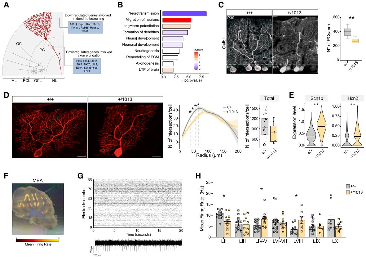 为了开始厘清Cxcr4失调对颗粒细胞(GCs)的内在影响,我们从P5代Cxcr4+/1013小鼠和对照组小鼠的小脑中分离出颗粒细胞,并进行体外培养,从而排除了局部迁移信号的影响。在体外培养第1天(DIV1),我们用pAAV-hSyn-mCherry病毒感染颗粒细胞,以稀疏标记神经元用于形态学分析(图5F和5G),同时用pAAV-hSyn-GCaMP6s病毒感染,以观察其自发性电活动(图5F-5H)。在体外培养第7天(DIV7),我们观察到与对照组相比,Cxcr4+/1013神经元的初级和次级分支数量显著增加,而神经突长度保持不变(图5G),这表明Cxcr4失调对小脑神经元的形态复杂性有直接影响。在同一阶段,我们发现与对照组相比,WHIM综合征小鼠的颗粒细胞在多个神经元中的 spike频率和 spike同步率显著提高(图5H)。这些发现与先前的研究一致,即Cxcr4/Cxcl12信号通路的改变(如在Cxcr4敲除模型中)不仅影响神经元的定位,还影响其内在特性,如兴奋性、树突生长和突触可塑性。99