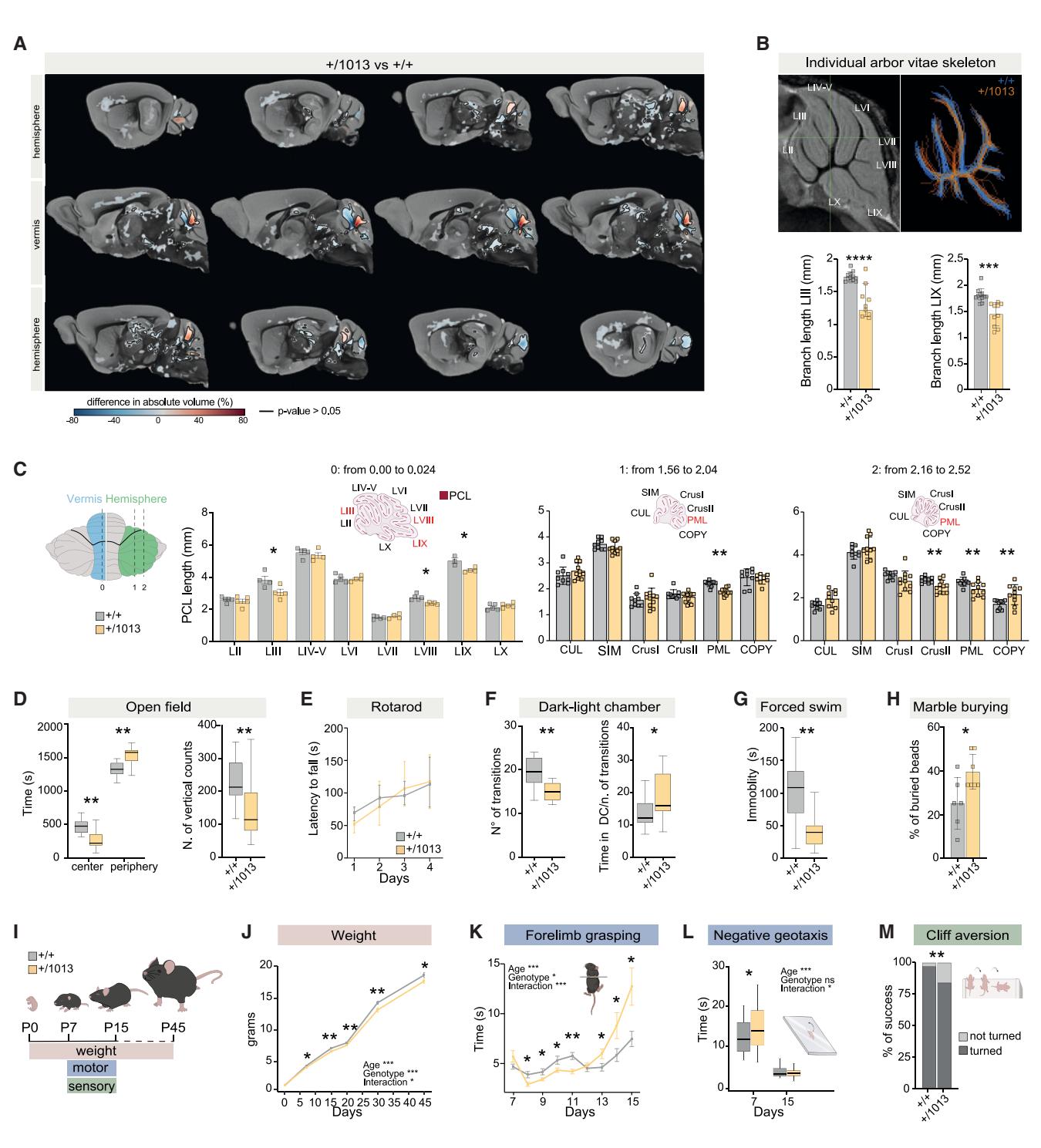 鉴于在WHIM患者中观察到的结构改变,我们对出生后第45天的WHIM小鼠和对照小鼠的大脑进行了MRI检查(图2A和图S2A)。离体MRI体素分析显示,WHIM小鼠的小脑存在选择性结构改变(图2A和图S2A;表S3和表S4)。最明显的缺陷出现在蚓部,我们观察到分隔LIV-V和LVI的原裂(fpr)处体积显著增加,而分隔LIV-V和LIII的前顶裂(fpc)处体积显著减少(图2A和图S2A)。由小脑传入和传出投射组成的白质树突状分支长度在LIII和LIX中减少(图2B),这表明Cxcr4+/1013小鼠中往返于小脑的感觉运动信息传导通路发生了变化。