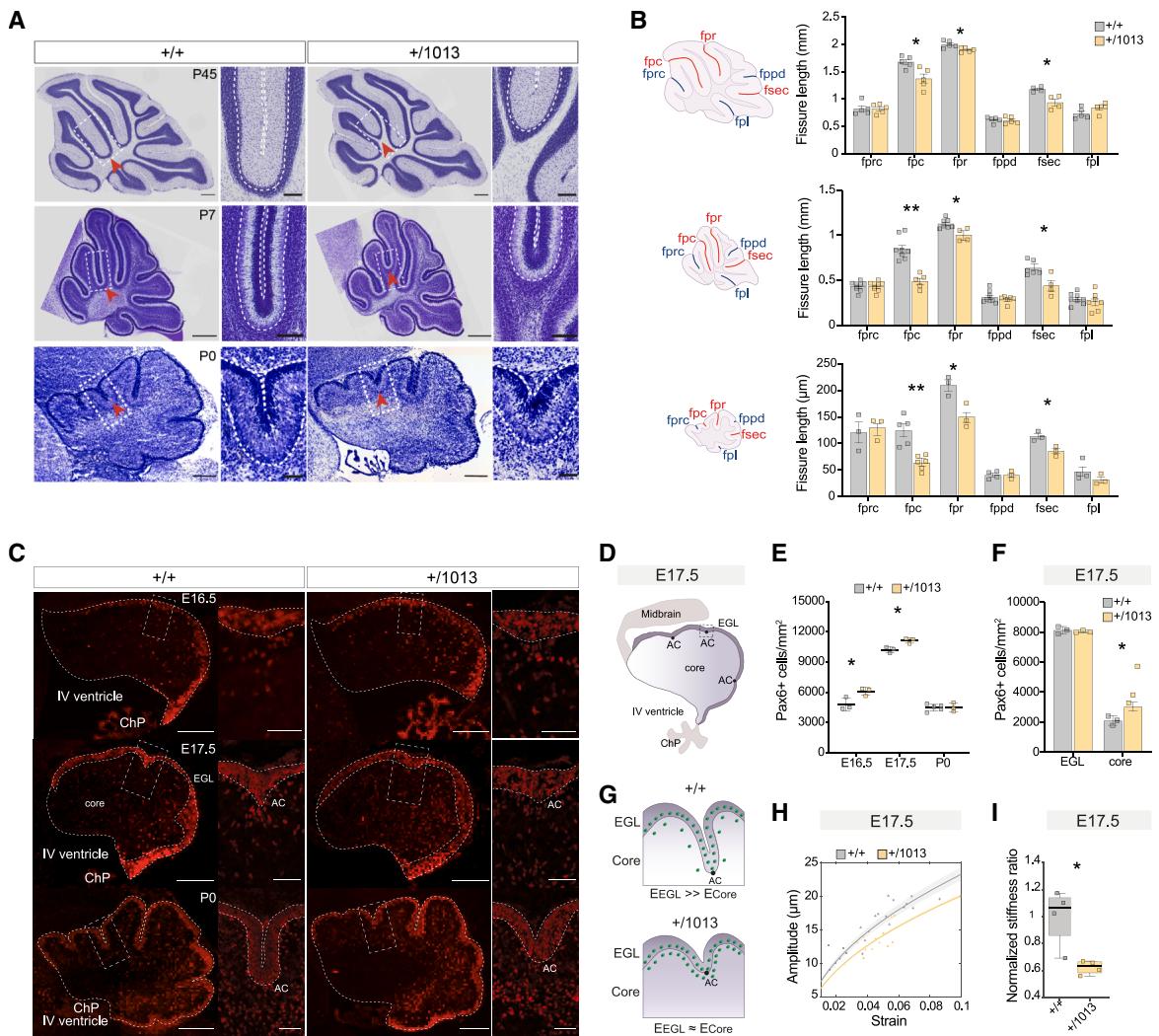 在发育中的小脑中,外颗粒层(EGL)和内核区的生长速率不同,导致细胞密度存在差异。这一过程会驱动锚定中心(ACs)的形成以及随后的沟回延长。91为了深入了解小脑异常叶形成的潜在机制92,93,我们评估了WHIM突变体中EGL和核心区的正常差异性扩张情况。我们使用真正的标志物Pax6来评估Cxcr4+/1013小脑中颗粒细胞祖细胞(GCPs)和颗粒细胞(GCs)的密度与数量。研究发现,在叶形成之前(E16.5、E17.5;图3C-3E),WHIM小鼠小脑中Pax6+细胞的密度显著增加,而细胞总数未发生改变(图S4B)。值得注意的是,在E17.5时,这种变化可归因于小脑核心区Pax6+细胞密度的增加(图3F和S4C)。我们的结果与先前提出的解释发育中小脑折叠动态的表面褶皱模型一致,该模型表明EGL和核心区之间存在差异性扩张91,94。因此,我们利用一个用于软双层材料的数学模型95来解释E17.5和P0时小脑切片的形态测量数据,并描述褶皱不稳定性的演变(图3G)。在E17.5时,核心区细胞密度的增加会降低新生叶的振幅(图3H),这源于EGL和核心区之间刚度比的降低(图3I和S4D)。尽管在P0时观察到明显的形态变化(图3A和3C),但Pax6+细胞密度(图3C和3E)和褶皱分析(图S4E)均未出现差异。这些机械性改变导致了在WHIM突变体中观察到的异常折叠模式,并突显了颗粒细胞祖细胞行为在产前的关键动态变化。