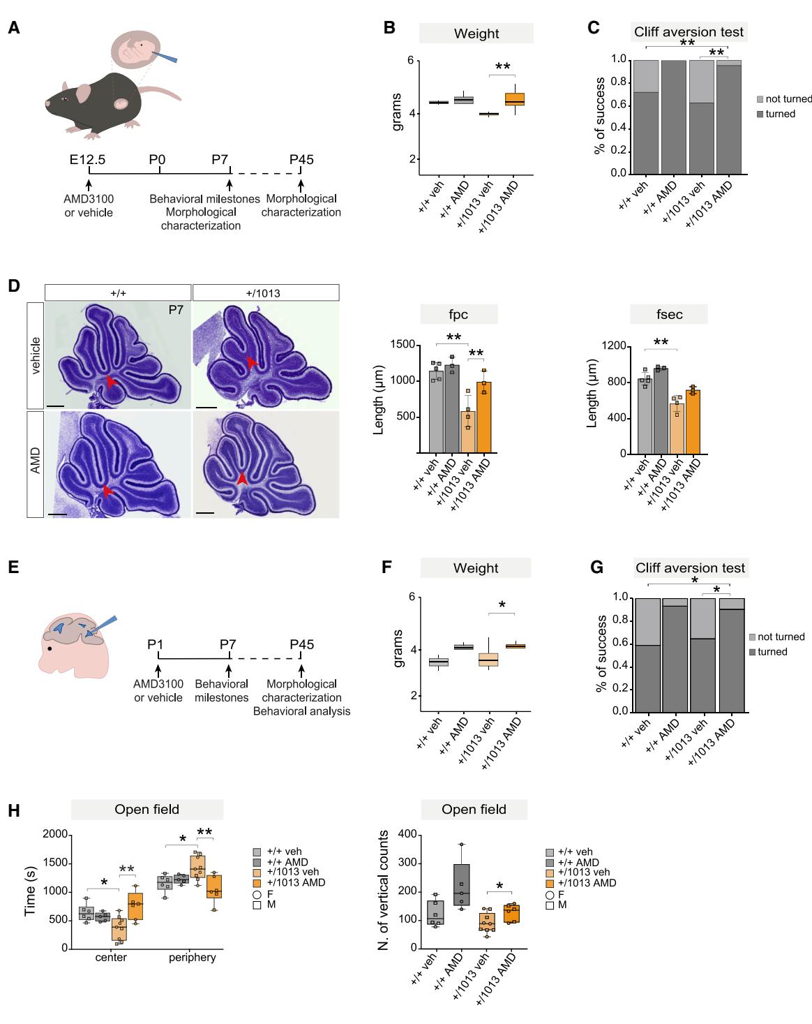 AMD3100(目前用于WHIM患者的临床试验:临床试验.gov:NCT02231879;NCT00967785;NCT01058993)或生理盐水被注射到WHIM和对照胚胎(E12.5)或幼鼠(P1)的第四脑室。