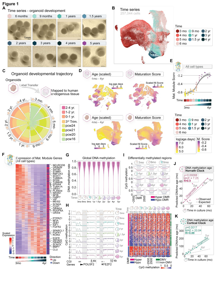 人类大脑发育是由空间和时间调控的基因表达波所定义的转录程序协调进行的。这些基因表达模式通过调控元件活性的动态变化和表观基因组重构被紧密协调,确保不同神经细胞类型的适时出现以及神经系统的逐步成熟。在人类中,大脑发育与成熟进程明显较大多数其他物种缓慢,皮质神经元需要数年才能达到完全成熟。这种延长时间线在人类多能干细胞(hPSCs)生成的所有细胞类型(包括皮质神经元)中均得以保留in vitro,指向一种设定大脑发育节奏的细胞内在时钟,尽管其分子机制和功能意义仍有待阐明(Ciceri et al., 2024; Del Dosso et al., 2020)。近期研究揭示了表观遗传屏障在维持人类神经元缓慢成熟时序中的重要性(Ciceri et al., 2024),以及物种特异性线粒体代谢速率对发育节奏的影响(Casimir et al., 2024)。人类类器官原则上可用于研究这些大脑成熟过程,但现有模型主要重现早期发育进程,且多数研究未对类器官进行足够长时间的追踪。有研究报告将类器官培养长达694天,并采用批量RNA测序和甲基化芯片分析整个类器官(Gordon et al., 2021)。然而,由于缺乏对这些系统中特定细胞类型的解析数据,以及更长的成熟时间线记录,我们目前对人类大脑中多种细胞类型如何量度和记录时间的机制仍缺乏理解。