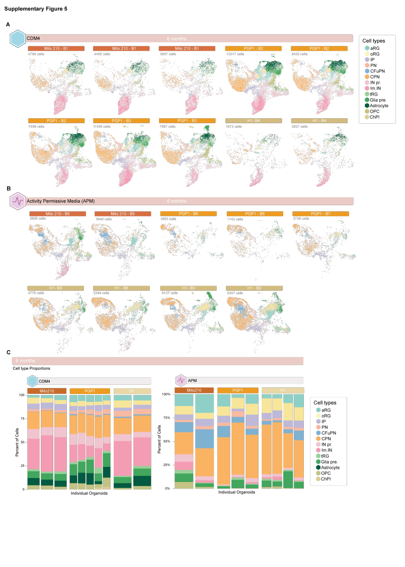 通过使用At奇森距离评估的可重复性表明,经CDM4和APM处理的类器官均紧密聚集;在所有发育阶段及两种条件下,样本间变异均处于内源性组织变异范围之内,这表明APM培养体系保留了我们在该类器官模型中先前证实的高重复性(Antón-Bolaños et al., 2024; Uzquiano et al., 2022)(图4E,附图6G)。基于APM会促进更高神经元活性从而有利于兴奋性神经元群体在长期培养中维持的假设,我们检测了不同培养条件下各细胞类型比例随时间的变化。我们特别关注胼胝体投射神经元(CPNs)的长期维持情况——这类晚发的兴奋性神经元群体在人类中相较于其他哺乳动物更为发达,并与高等认知功能的演化相关(Berg et al., 2021)。值得注意的是,早在6个月时(CDM4:n==10, 64,817个细胞;APM:n=9, 41,231个细胞),我们就观察到培养基条件引起的细胞组成显著差异:APM组中兴奋性神经元亚型(包括胼胝体投射神经元CPNs和皮质传出投射神经元CFuPNs)比例增加,而胶质细胞群体与抑制性神经元比例下降(FDR校正P值:1.15×10-2(aRG)、3.38×10-7(oRG)、1.95×10-2(IP)、9.23×10-8(CFuPN)、2.69×10-8(CPN)、1.24×10-5(IN祖细胞)、4.19×10-6(未成熟IN)、4.81×10-2(tRG)、1.52×10-1(胶质前体细胞)、4.33×10-13(星形胶质细胞)、2.46×10-2(OPC),负二项混合效应模型,图4B-D、F)。值得注意的是,CPNs的富集效应在9个月和12个月时依然保持[FDR校正p值:7.05×10-3(9月CPNs)及1.96×10-2(12月CPNs)]。这些结果表明APM培养条件能选择性促进兴奋性皮质神经元(包括CPNs)的长期维持与稳定性(附图6F)。