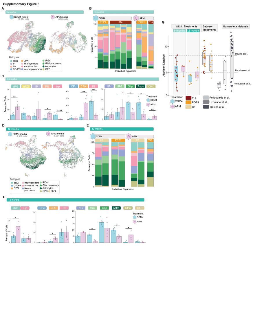 A、9个月大CDM4处理组(n = 6个类器官,18,104个细胞)与APM处理组(n = 3个类器官,8,533个细胞)整合scRNA-seq数据的UMAP降维图,按细胞类型着色。