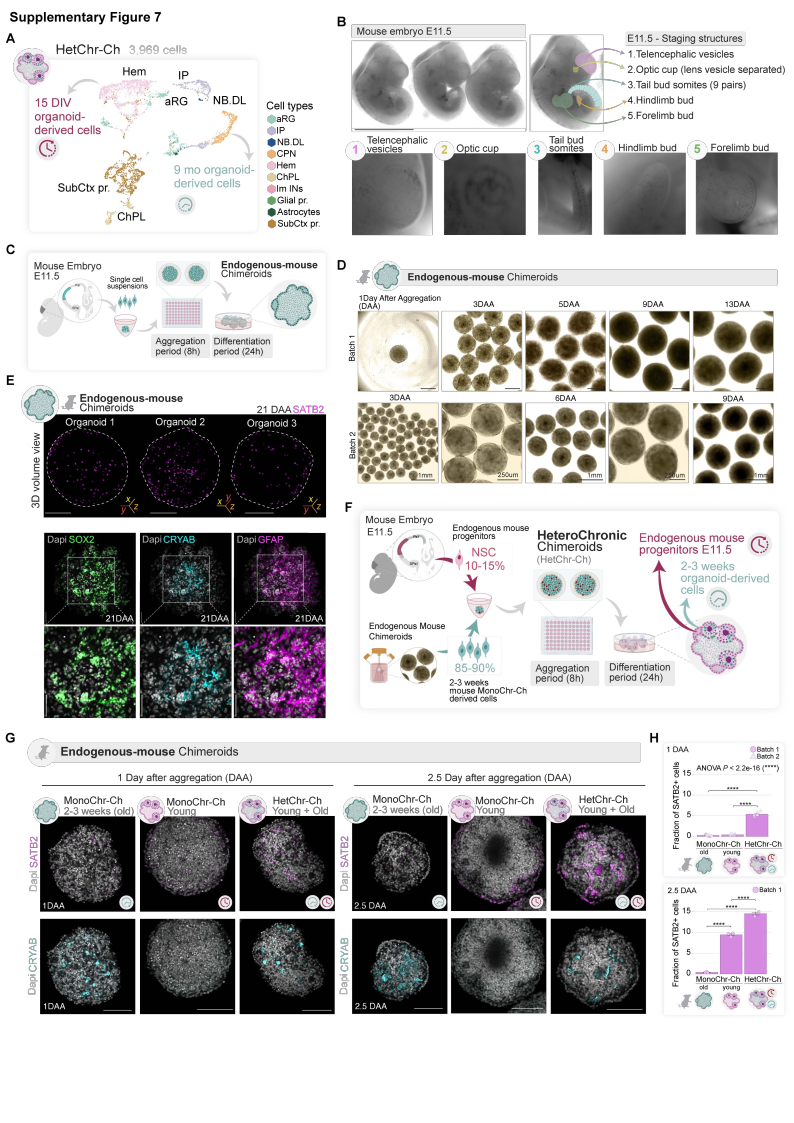 为验证这些发现,我们重复了相同实验,但改用源自胚胎小鼠大脑的祖细胞。该体系具有发育速度快、祖细胞呈内源性起源的独特优势。我们从小鼠E11.5胚胎中解剖获取大脑皮层,并将悬浮单细胞接种培养以生成内源性小鼠皮层嵌合体(补充图7B-D)。培养两周后,这些类器官主要表达星形胶质细胞标志物及CPN标志物SATB2(补充图7E)。随后我们通过以下两种方式构建嵌合体:单独混合两周龄类器官的祖细胞(MonChr),或将两周龄类器官细胞与新鲜解离的年轻E11.5细胞混合(HetChr,补充图7F)。鉴于小鼠发育时间线快于人类,我们在聚集后第1天对培养体系进行分析(补充图7G)。与人源模型观察结果一致:虽然单染色体小鼠培养体系仅呈现微弱的SATB2表达,但异染色体条件下SATB2阳性细胞比例显著更高(ANOVA P值 < 0.05)。值得注意的是,对照仅含年轻细胞的单时序嵌合体类器官需要更长时间才开始产生SATB2阳性细胞,这与它们尚未完成早期发育阶段的事实相符。数据显示,较老的类器官中的细胞正在特异性重启与其后期发育阶段相适应的神经生成程序(补充图7G、H)。