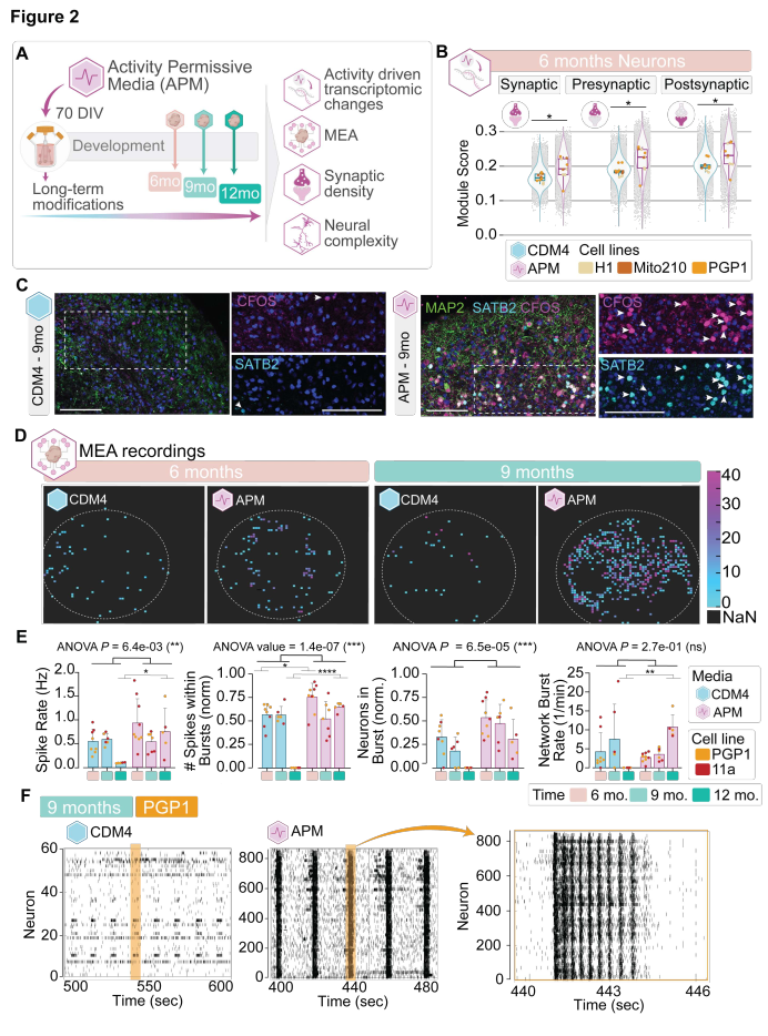 鉴于神经元活动对神经元成熟、功能与存活的关键作用,我们改良了先前为维持自发性活动而设计的培养基(BrainPhys(Bardy et al., 2015)),以测试其能否支持类器官中神经元存活超过6个月。我们测试了一种改良的BrainPhys基础培养基(将其命名为活动许可培养基APM,详见方法),并从体外培养第70天开始使用APM培养类器官(图2A)。研究发现,在培养至6个月时,APM培养的类器官神经元在突触相关基因模块评分上呈现显著提升(详见方法)(图2B,附图3A-D)。免疫组化实验证实,在9月龄类器官的胼胝体投射神经元中出现了神经元活动早期标志物c-FOS的表达(图2C)。基因本体分析进一步支持了突触组织与功能相关GO条目的富集现象(附图3E)。这些数据共同表明,APM培养的类器官展现出与神经元活动增强相一致的转录应答特征。