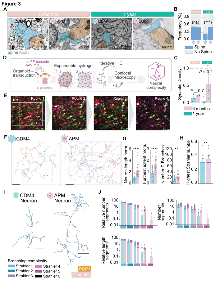 我们进一步探究APM培养是否能增强神经元复杂性(即树突分枝与突起生长)——这是衡量皮质神经元成熟的明确指标in vivo。我们采用表位标签条形码技术(Dhainaut等人,2022;Kudo等人,2022;Rovira-Clavé等人,2022;Wroblewska等人,2018)作为新型追踪策略(Park等人,2025),以重建密集类器官组织中单个神经元的形态(图3D、E及附图4E)。该方法利用抗原正交性“怪物荧光蛋白”(smFPs)(Viswanathan等人,2015)中不同表位标签组合的随机表达,确保稳健的胞质条形码填充(详见方法)。结合专为稳健多轮表位标签读取而优化的放大显微成像策略(Klimas等人,2023a)(详见方法),该技术能够实现高分辨率检测单个神经元,并在密集标记组织中追踪其细微突起。