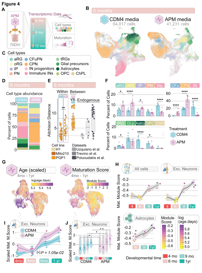 为了评估APM治疗是否促进了转录成熟以及神经元群体的维持,我们采用了基于DIALOGUE的模块评分方法。在图1D中,使用了从Velmeshev等人的内源性大脑数据集中推导出的相同成熟相关基因模块(Velmeshev et al., 2023)。与CDM4类器官一样,APM类器官在培养时间与成熟模块评分之间显示出强相关性(图4G, H)。重要的是,这种方法使得能够沿着时间轨迹对APM和CDM4培养的类器官进行直接比较。对于兴奋性神经元(图4J),随着时间的推移,APM类器官在成熟指数上的得分始终高于CDM4类器官(单侧F检验 P = 1.05× 10-2, 线性模型); 这些差异在所有时间点上都显著,除了在6个月时(似然比检验 P 值 = 4个月: 2.05 × 10-2; 6个月: 5.48×10-2; 9个月: 1.65×10-2; 12个月: 2.03×10-3; 线性混合效应模型) (图4J)。