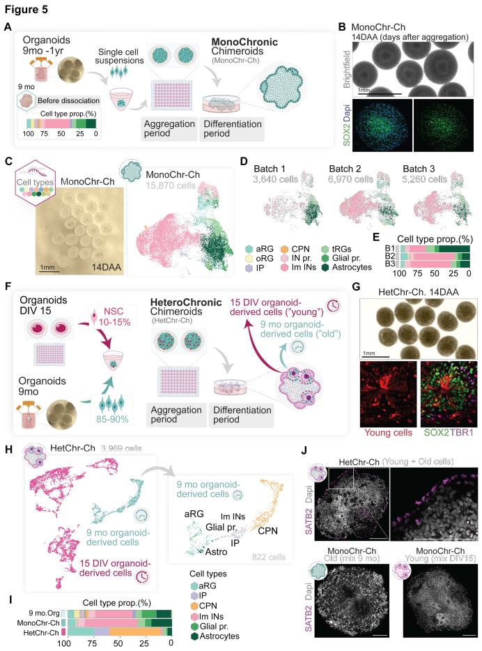 首先,我们通过解离并混合来自晚期皮质类器官(9至12月龄)的细胞,制备出单时序嵌合体(MonChr)。尽管这些细胞在培养体系中存活已久,仍能被解离并重聚以启动新类器官的形成,但所得类器官尺寸较小,这可能是由于老旧神经祖细胞增殖能力有限所致(图5A、B)。为探究MonChr的细胞组成,我们在重聚后15-19天采用单细胞RNA测序技术对批次混合嵌合体(每批含15-20个嵌合体)进行了分析。