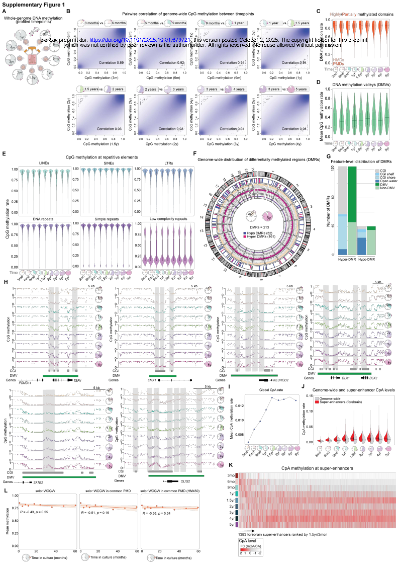 为界定类器官在长期培养中是否呈现与年龄相关的表观遗传程序,我们随后对不同培养时长的单个体类器官进行全基因组亚硫酸氢盐测序(WGBS)。DNA甲基化——尤其是在年龄相关CpG位点的甲基化——可作为生物年龄的强大分子读数(Moqri等人,2025年)。我们在3个月至5年的培养周期中设置了九个时间点进行类器官采样(图1G-F,附图1A)。In vivo,跨多种组织的研究表明,甲基化组在早期发育阶段具有动态变化特征,但随后会达到稳定高位并长期维持。相比之下,二维培养体系中的甲基化组更不稳定,表观基因组漂移现象较为常见(Cruickshanks等人,2013年;Edgar等人,2022年;Franzen等人,2021年;Nishino等人,2011年;Zhou等人,2018a年)。延长时间尺度的WGBS分析显示,类器官能保持DNA甲基化模式的整体稳定性(图1G),这与出生后及成年皮质组织中观察到的高位稳定甲基化水平相似。全基因组甲基化的配对比较显示相邻时间点间存在强相关性(皮尔逊相关系数= 0.89–0.94),佐证了多年培养体系中甲基化景观的稳定性(附图1B)。所有时间点的全局CpG甲基化均保持高位;易受甲基化漂移影响的区域in vitro—部分甲基化域(PMD)与高度甲基化域(HMD)——在五年培养期内各年龄段均维持近乎完全的甲基化水平(附图1C)。作为发育调控区域标志的DNA甲基化谷(DMV)始终保持稳定(附图1D)。重复元件上的CpG甲基化同样保持时序稳定性,进一步印证了类器官表观遗传景观的长期类器官培养中的甲基化组(补充图1E)。这些发现共同表明,类器官在长期培养过程中的纵向甲基化景观与内源性组织的表观遗传特征相似。尽管内源性组织的甲基化总体稳定,但特定发育相关基因的甲基化状态调控对于细胞命运特化和整体发育至关重要。为探究发育调控基因座在类器官中是否会随时间发生规律性变化,我们检测了关键皮质基因的CpG甲基化情况——FEZF2和TBR1用于深层投射神经元,POU3F2 用于上层神经元身份确定,NEUROD2用于更广泛的兴奋性神经元分化。所有这些基因座均呈现渐进性、时间依赖性的甲基化增加,尤其在CpG岛和DMV区域内(图1H和补充图1H)。为解析类器官发育过程中的时序性变化,我们通过对比两个终点(3个月与5年)进行差异甲基化分析,识别出差异甲基化区域(DMRs,补充图1F)。DMRs凸显了基因组中甲基化在不同条件间(此处指早期与晚期培养)发生动态改变的区域。我们共发现213个与年龄相关的DMRs,包括在此期间甲基化增加的超甲基化DMRs和甲基化减少的低甲基化DMRs(补充图1G)。通过观察这些DMRs在中间时间点的动态变化,我们发现甲基化转变并非突然或随机出现,而是在培养期间持续渐进产生,提示存在严格调控的表观遗传程序(图1I)。相对较少的DMR数量及其在中间时间点的逐步显现,表明这是非随机波动的协同调控而非随机漂变。功能注释显示DMRs富集于具有已知发育重要性的表观遗传特征区域,包括CpG岛屿、DNA甲基化谷和基因调控元件。值得注意的是,与这些差异甲基化区域相关的基因包含许多已知在发育中新皮层起关键作用的基因,例如PAX6, HES6, EMX1, EMX2, NES, TBR1, EOMES, SATB2, POU3F2 (图1I)。虽然由于文献中可用的in vivo数据有限,很难量化可比in vivo发育窗口中甲基化变化的确切数量,但在类器官中观察到的差异甲基化区域的数量和性质、它们富集于发育相关基因座并显示协调进展的事实,都与程序性in vivo甲基化调控而非随机甲基化漂变的结果相一致。